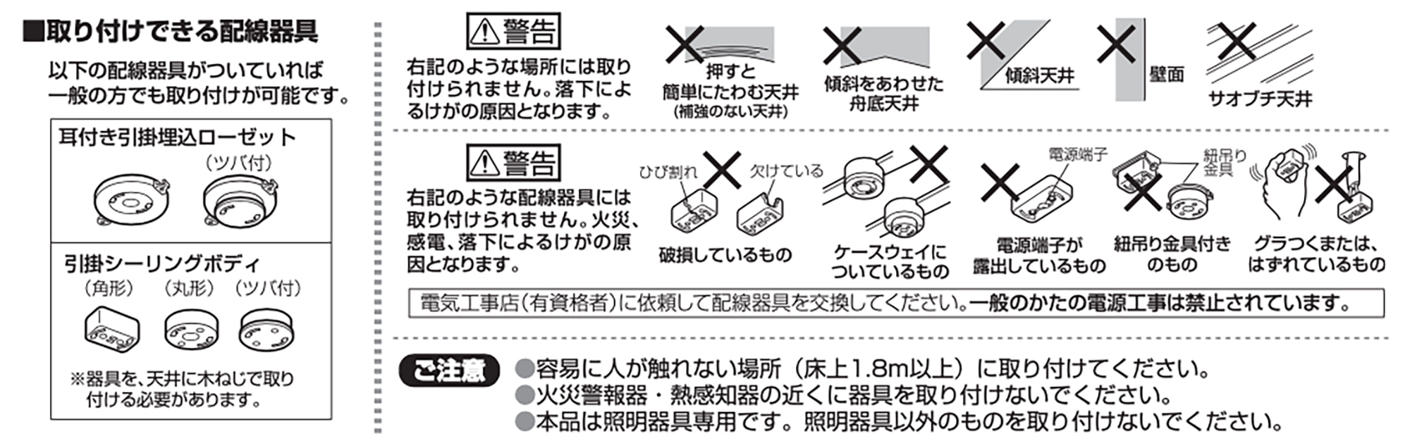| 取付可能照明電力 | 6Aまで(白熱電球の場合は合計600Wまで、電球形蛍光灯の場合は合計375Wまで) |