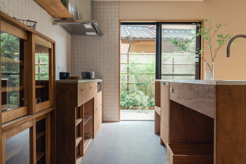 家具のような設えで造作したアイランドキッチン。コンロは壁側に据えたⅡ型のレイアウトにして、見晴らしの良いキッチンにしています。