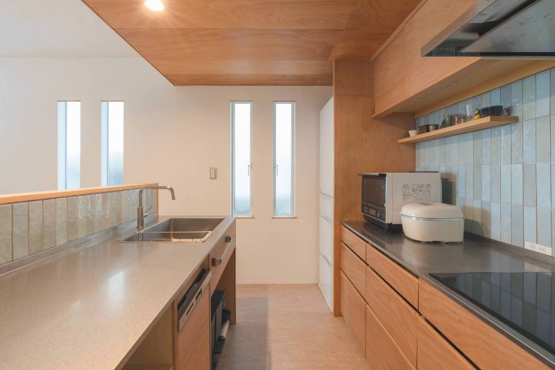 キッチンには「オーダーキッチン天板」を採用いただきました。バイブレーション加工をかけているので、業務用感が出過ぎず異素材たちとも馴染みヨシ。