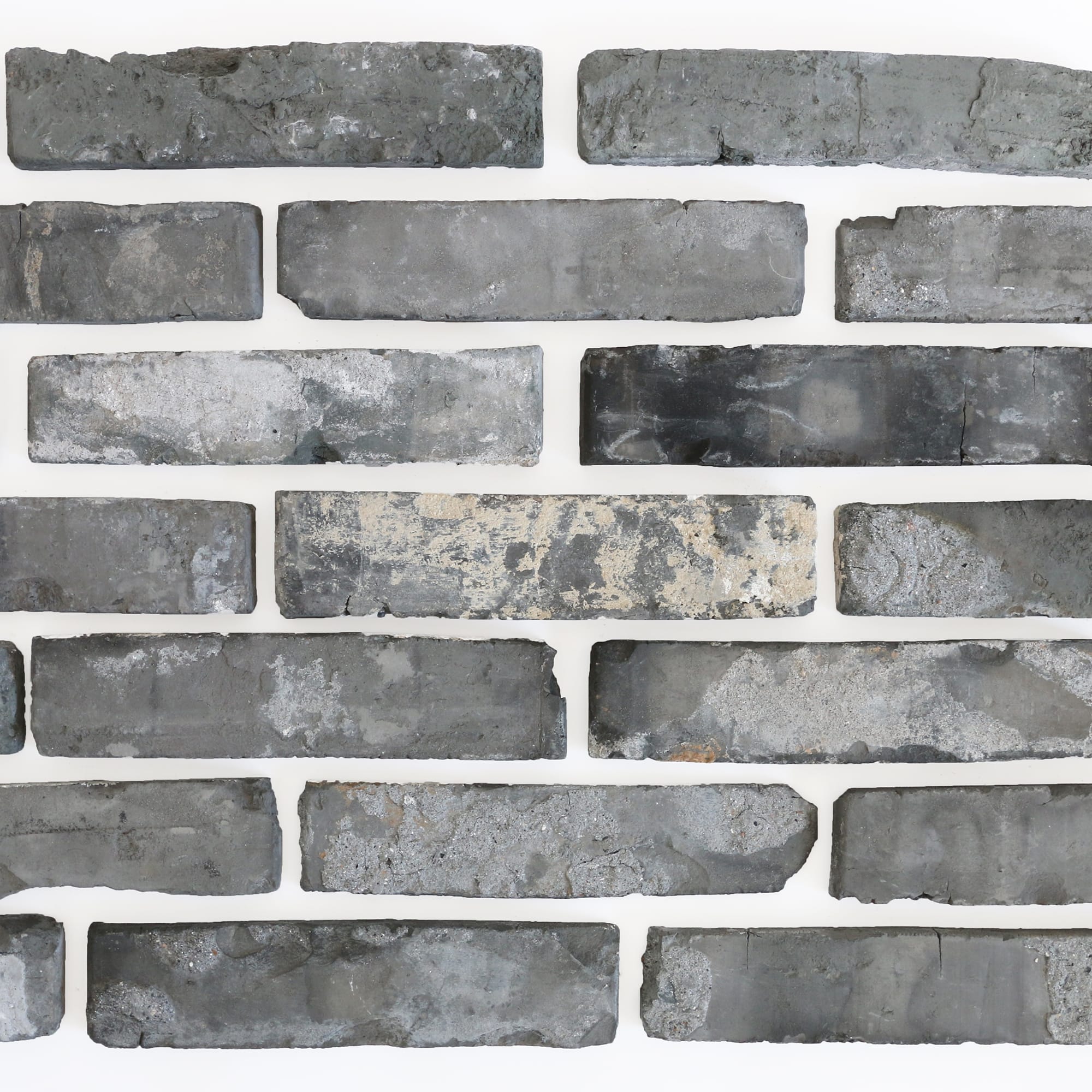 アンティークレンガをスライスしてつくっているため、タイルの状態にかなりのばらつきがあります。形が不揃いだったり、割れや欠けがあったり、表面に白いモルタルが残っていたり、煤けて黒っぽくなっているものなど。