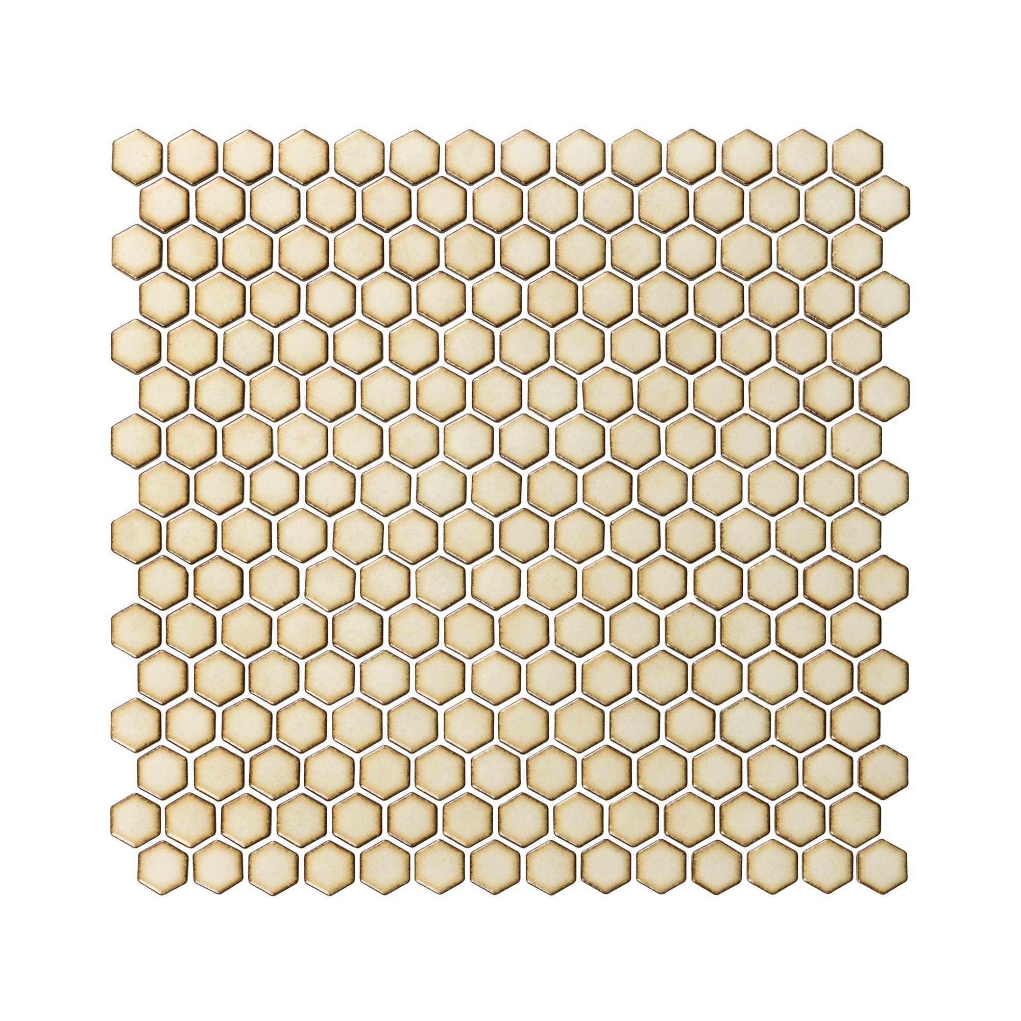 窯変の味わいを活かした六角形のモザイクタイルです。六角形が際立つアイボリーにブラウンの縁取り。