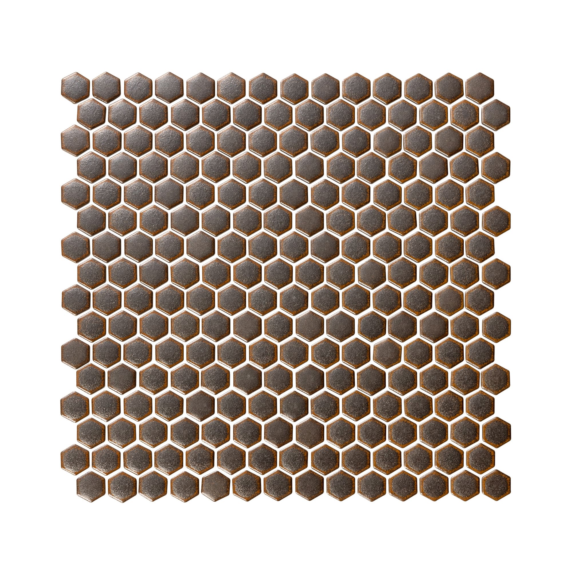 窯変の味わいを活かした六角形のモザイクタイルです。鉄サビのような暗い灰色と茶色のマットな質感。実際のサビではないので手触りはすべすべしています。