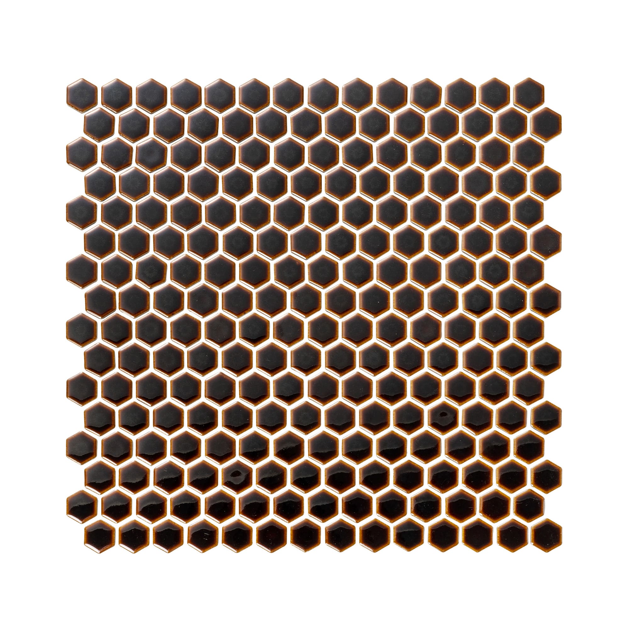 窯変の味わいを活かした六角形のモザイクタイルです。とろっと吸い込まれるような黒蜜色のツヤが魅力的。