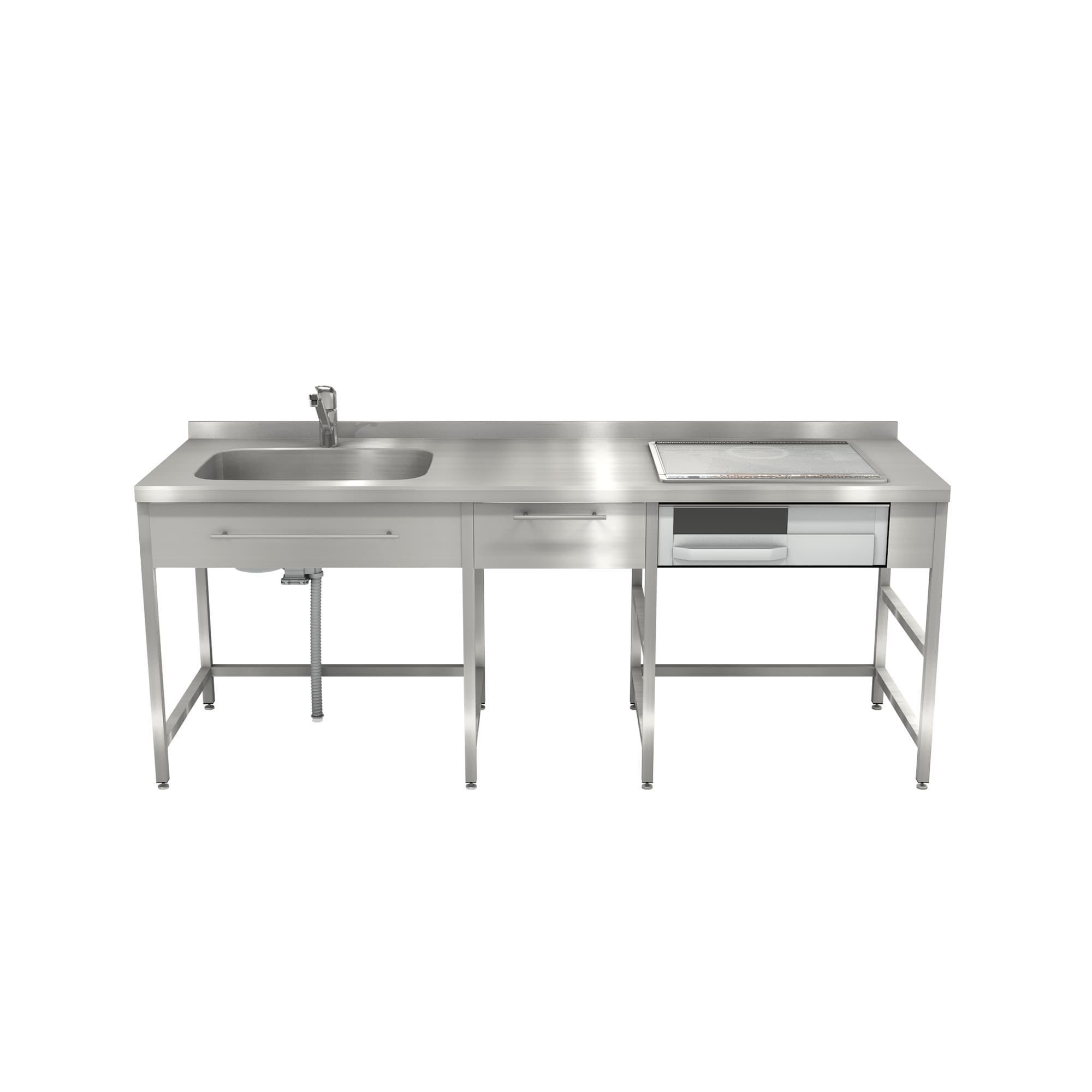その基本形のフレームに、水栓やコンロなどの設備機器や引き出しをそれぞれオプションで自由に付け足していくことが可能。もちろん、引き出しがいらない方は天板とフレーム脚だけで購入もOK。組み合わせ方は、普段自分がキッチンに立っている時を想像しながらじっくり考えてみてください。