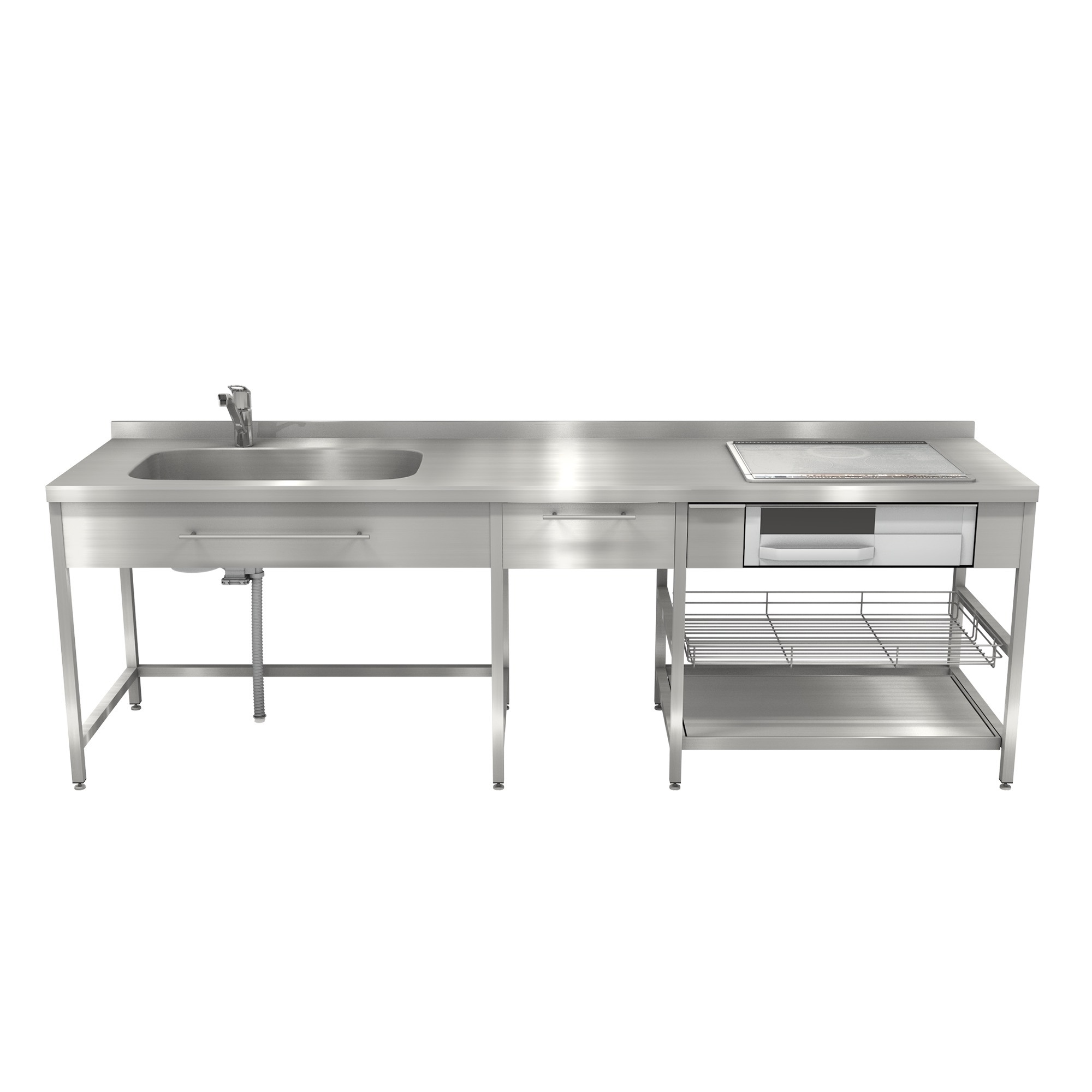 シンクのついた天板とフレーム脚。最小限必要なものだけを残し、その他の要素を削ぎ落とした超ミニマルな形を基本としたフレームキッチンです。