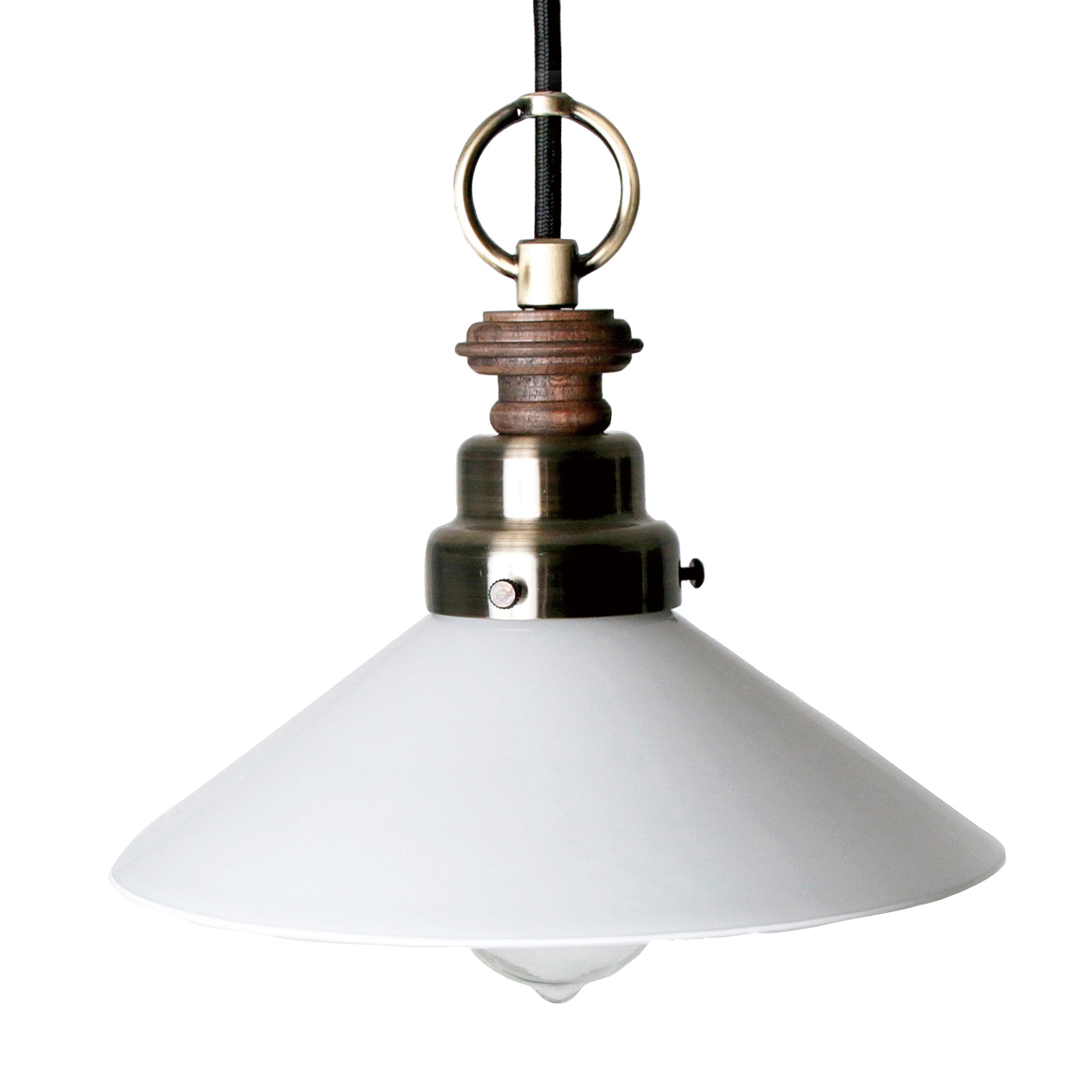 ガラスのシェードの上でアクセントになっている木製のパーツは、ヨーロッパの家具の脚などに多用されていた挽物を思わせるデザイン。真鍮色のリングパーツと相まって、素朴な手拭きガラスのシェードをさりげなく飾り立ててくれます。