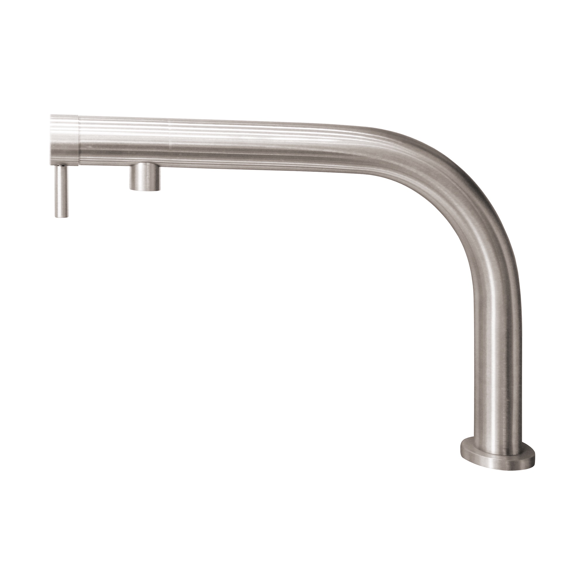 一般的な水栓は真鍮合金にクロームメッキが施され、表面をステンレス風に仕上げられているものがほとんどですが、この水栓は無垢のステンレスの塊から削り出して作られているのが最大の特徴。ステンレスの重厚感を存分に味わえます。
