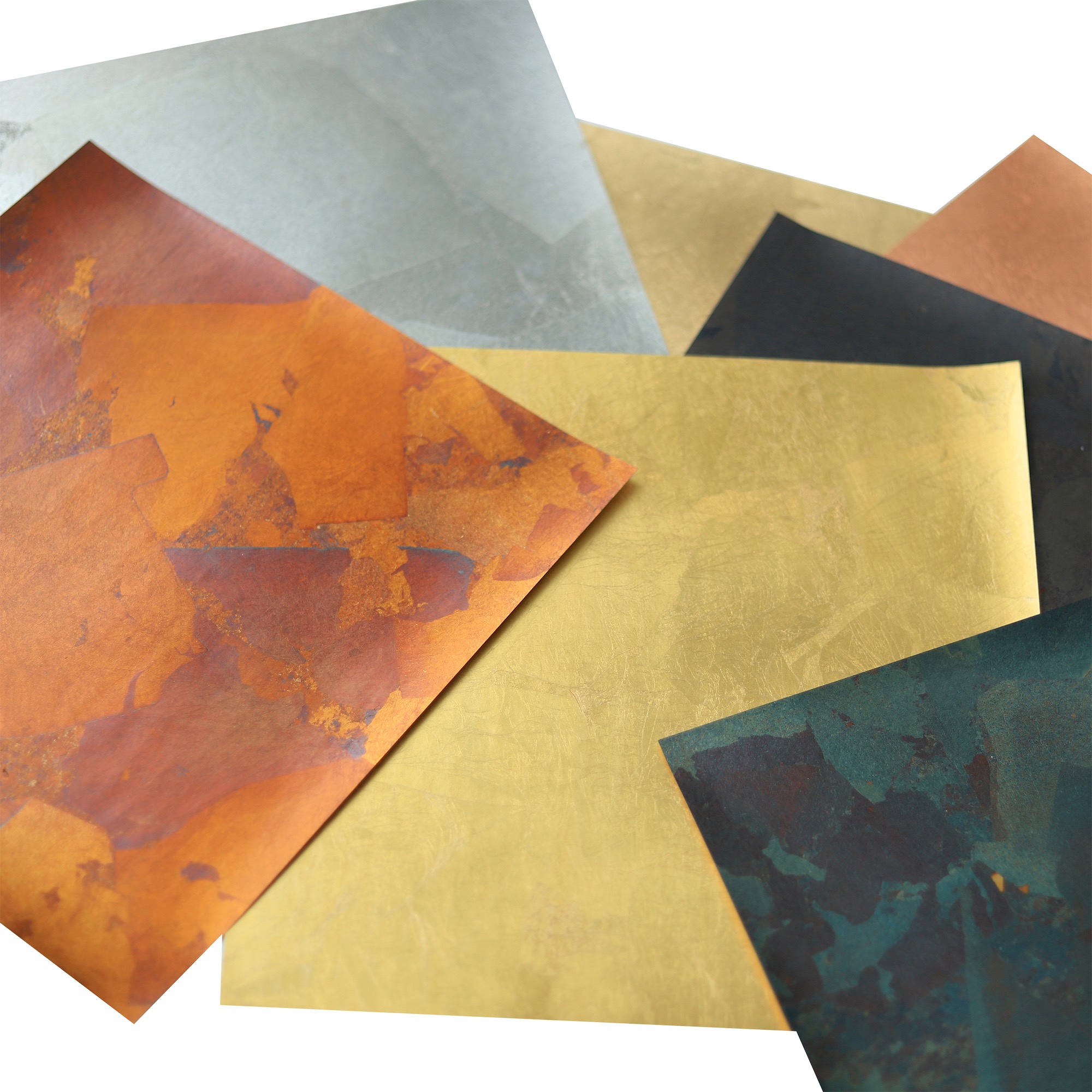 職人の手で箔押しされた本物の金属箔を、表面に特殊なトップコート、裏面には粘着剤を施し、手軽に装飾に用いれるようシート化したのがこちらの「箔シート」。見た目の美しさや独特なゆらぎだけでなく、手作業ゆえに箔の1枚1枚が異なる表情を持ち、その均質化されていない面持ちも箔シートの魅力です。