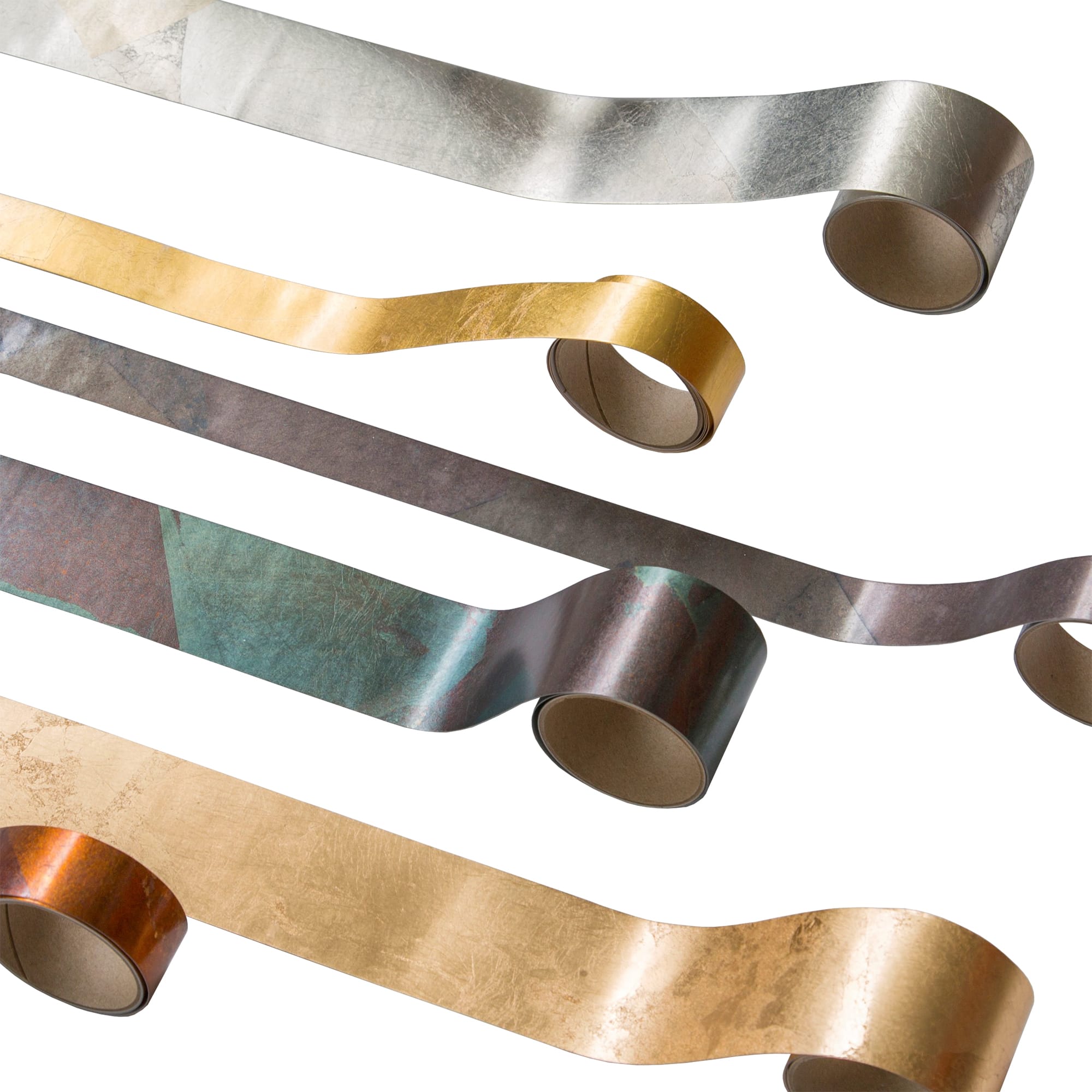 職人の手で箔押しされた本物の金属箔を、表面に特殊なトップコート、裏面には粘着剤を施し、手軽に装飾に用いれるようシート化したのがこちらの「箔シート」。見た目の美しさや独特なゆらぎだけでなく、手作業ゆえに箔の1枚1枚が異なる表情を持ち、その均質化されていない面持ちも箔シートの魅力です。