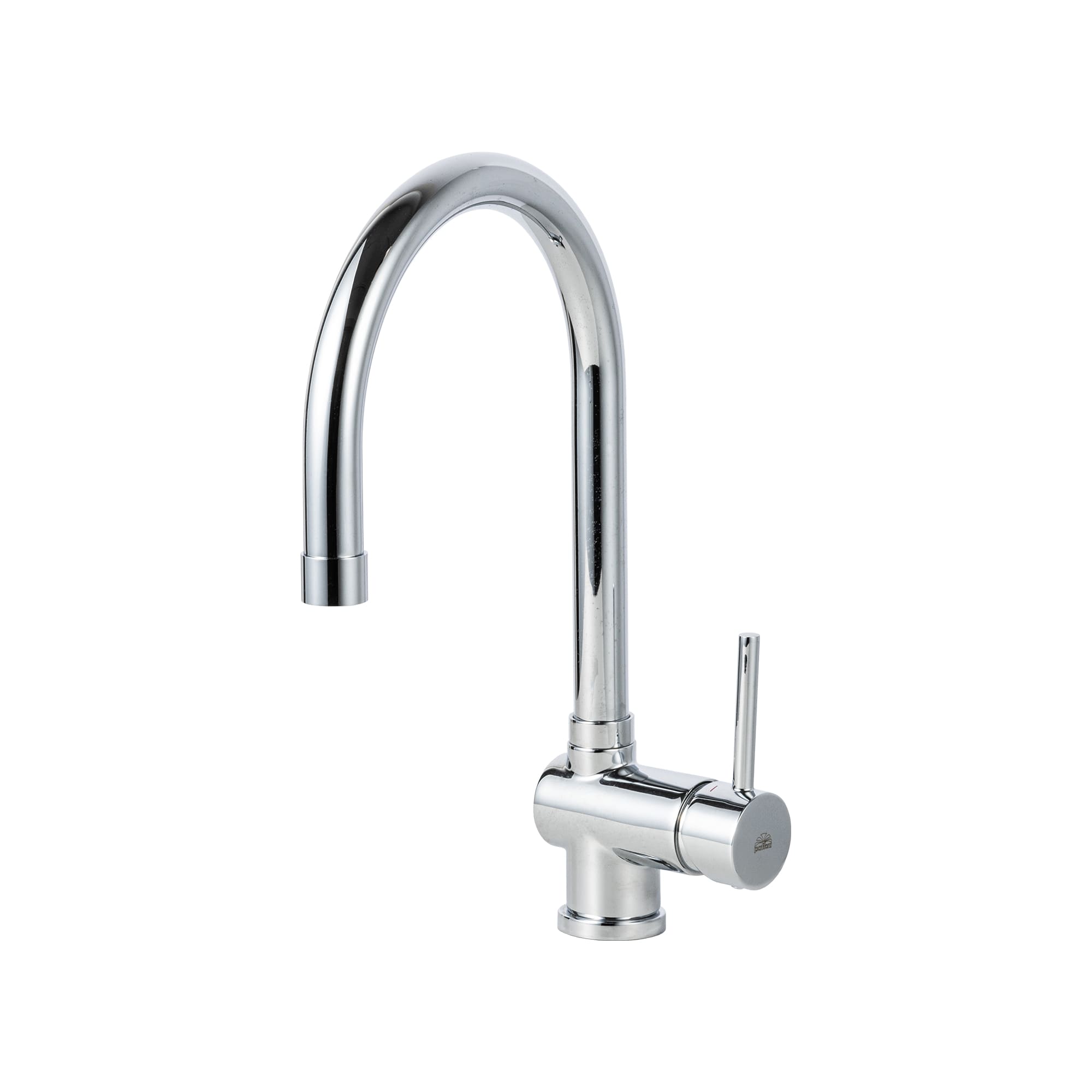 グースネック型は、クロームメッキとサテンメッキの2種類の仕上げを展開しており、こちらの光沢のあるクロームメッキ仕上げは、スタンダードでどんなシステムキッチンにもよく合います。