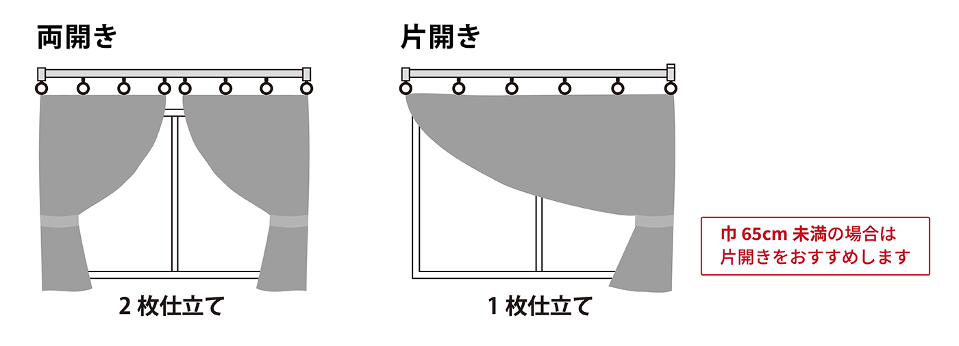 カーテンの耳裾仕様・吊り方・開き方をお好みにあわせて選べます。(いずれも価格は変わりません。)