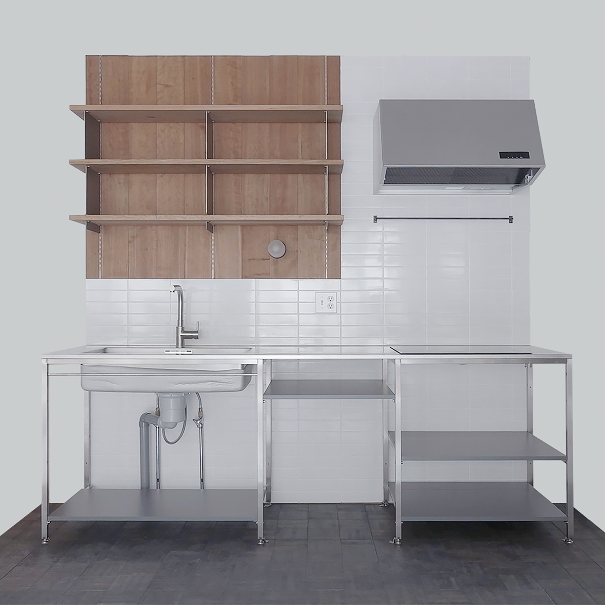 こちらは、上下オープンな棚で統一されたキッチン空間のセットアップです。キッチン本体や機器だけでなく空間を構成する壁材や床材もセットされています。