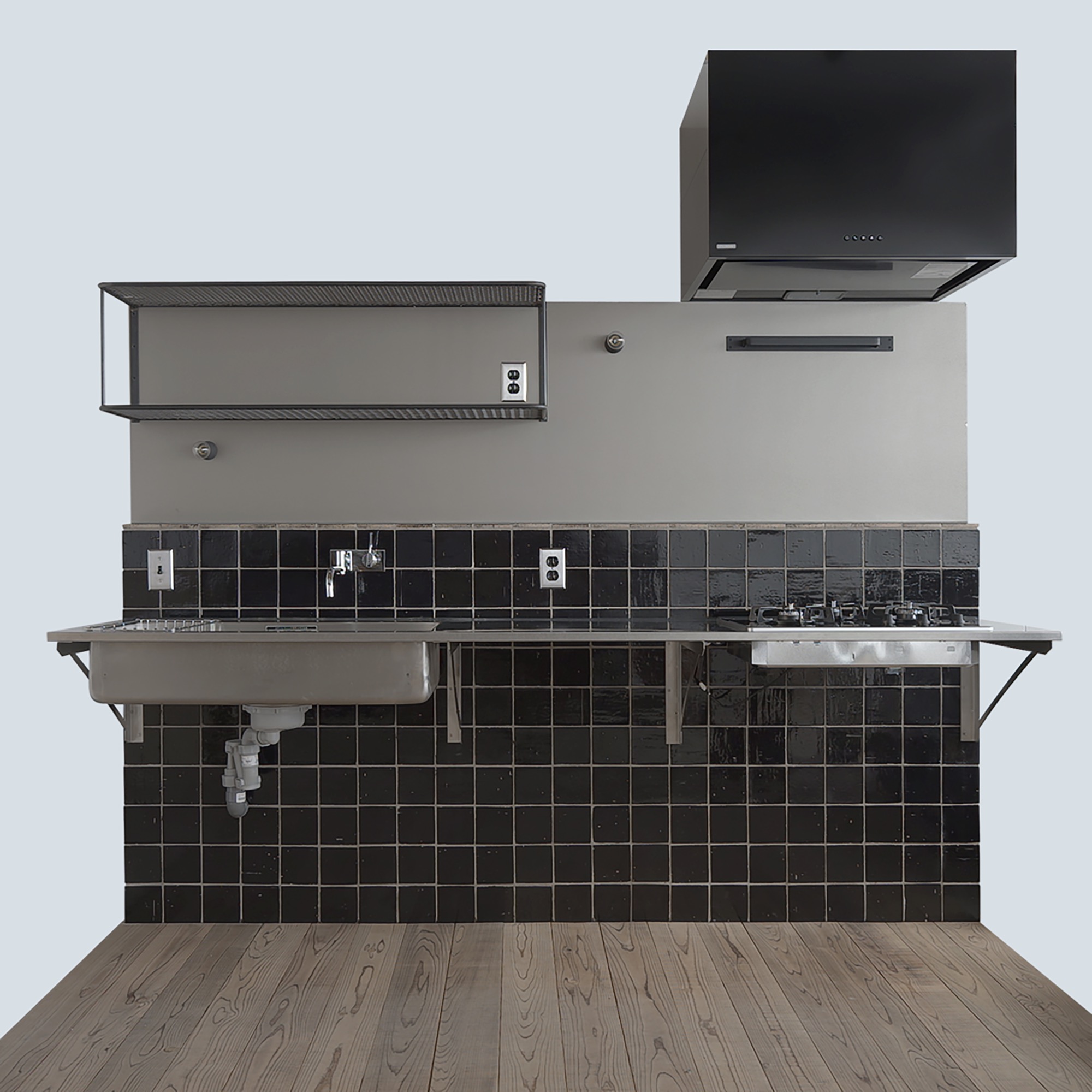 こちらは、一枚のステンレス天板でつくるミニマルなキッチン空間のセットアップです。キッチン本体や機器だけでなく空間を構成する壁材や床材もセットされています。