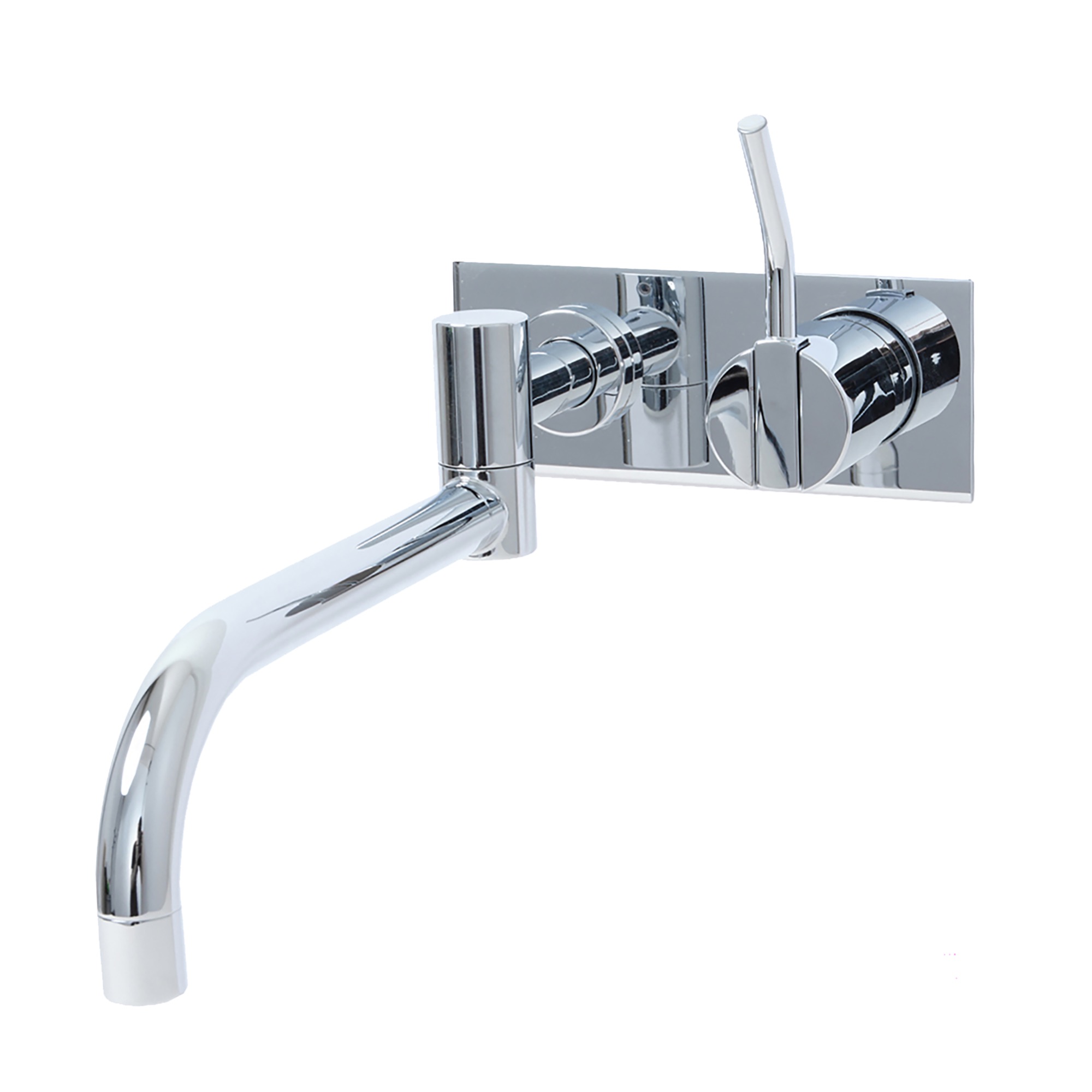 スパウトとレバーがスクエア型の台座に取りまとめられた、ひと塊の彫刻作品のように見せる美しいデザインが特徴の壁付け型の混合栓です。