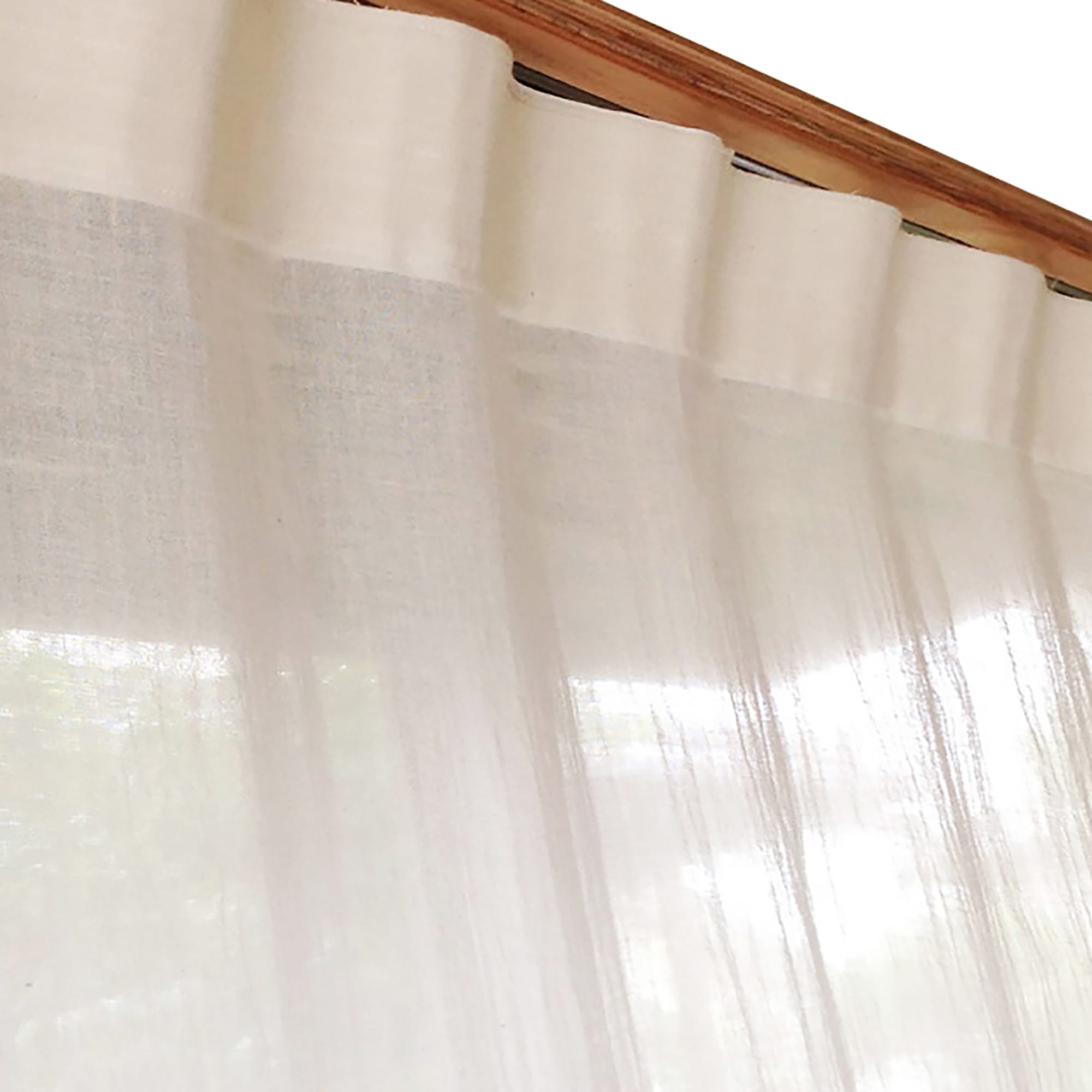 天然素材ですので、湿気が多いと伸び、乾燥すると縮みます。ガーゼカーテンは特に顕著で、毎日の生活の中で収縮やしわの変化に気づくほど。一日の中でも、キッチンでお湯を沸かしていると伸びたり、ストーブをつけて空気が乾燥すると縮んだり、まるで本当に生き物のようです。例えば梅雨時期と冬の乾燥時で2〜3cm伸縮します。生活に支障のない程度ですのでご安心を。