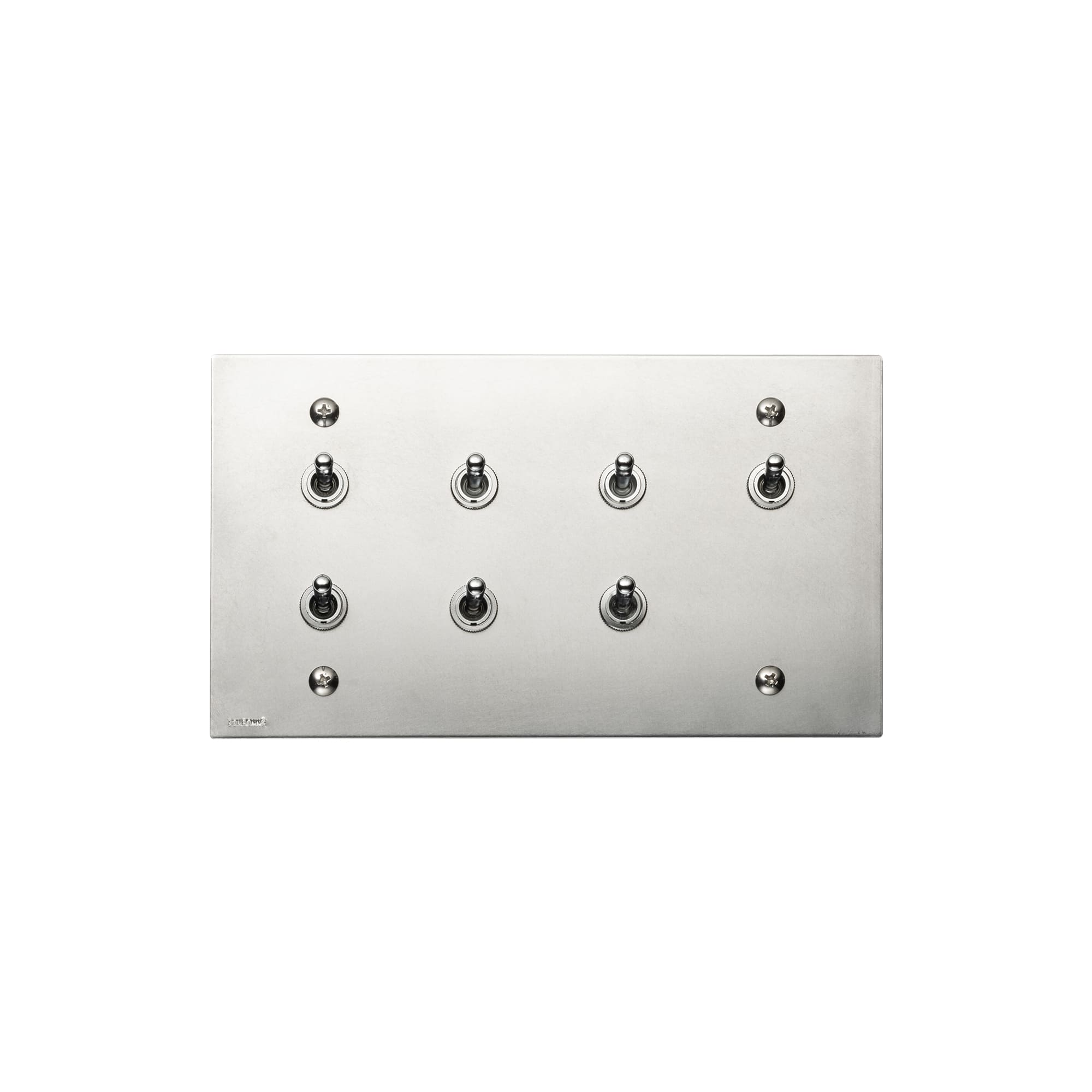 こちらはちょっと珍しい、少し大きめな横長のプレートに7つのスイッチが並んだタイプ。この数のトグルスイッチが並ぶと存在感は言うまでもなし。