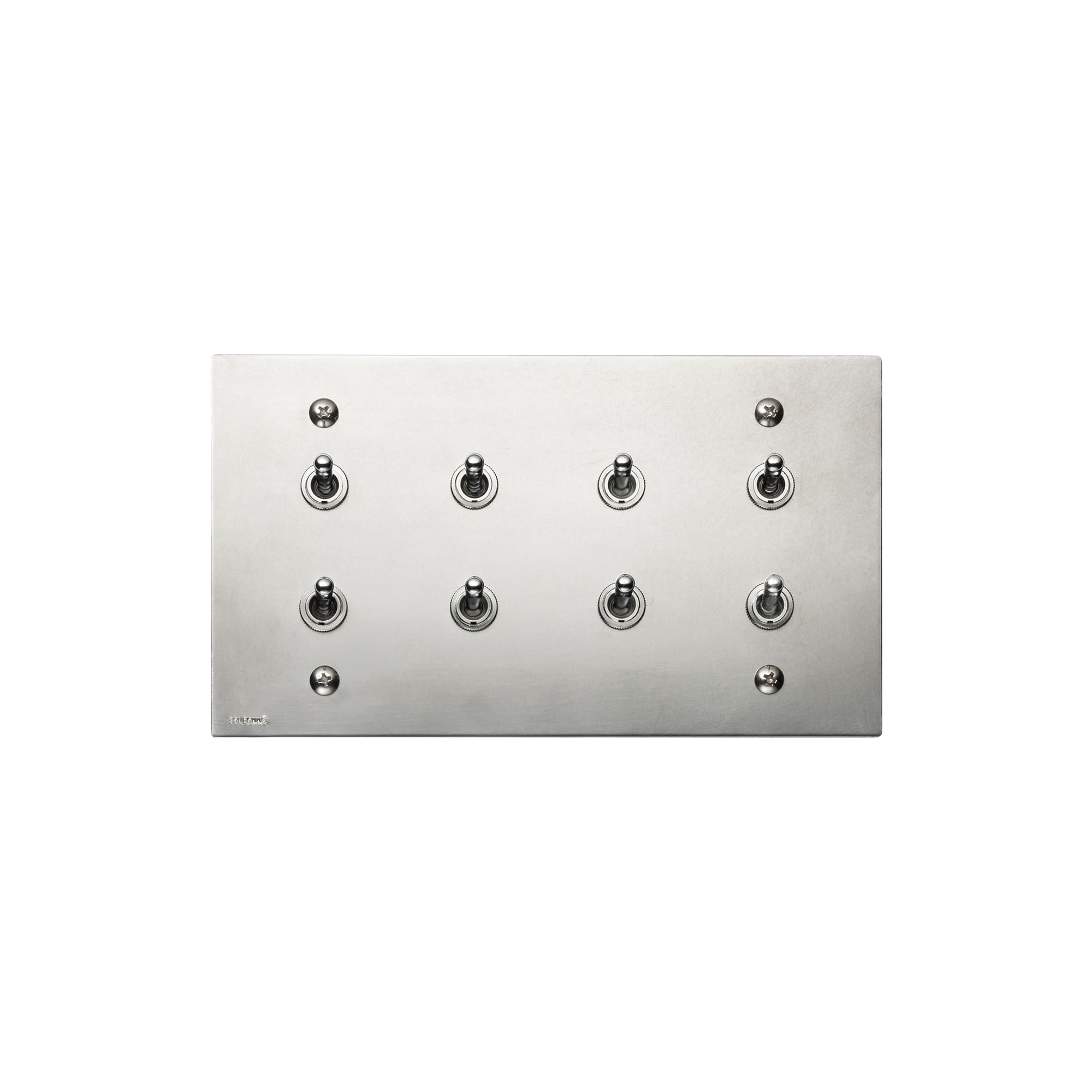 こちらはちょっと珍しい、少し大きめな横長のプレートに8つのスイッチが並んだタイプ。この数のトグルスイッチが並ぶと存在感は言うまでもなし。