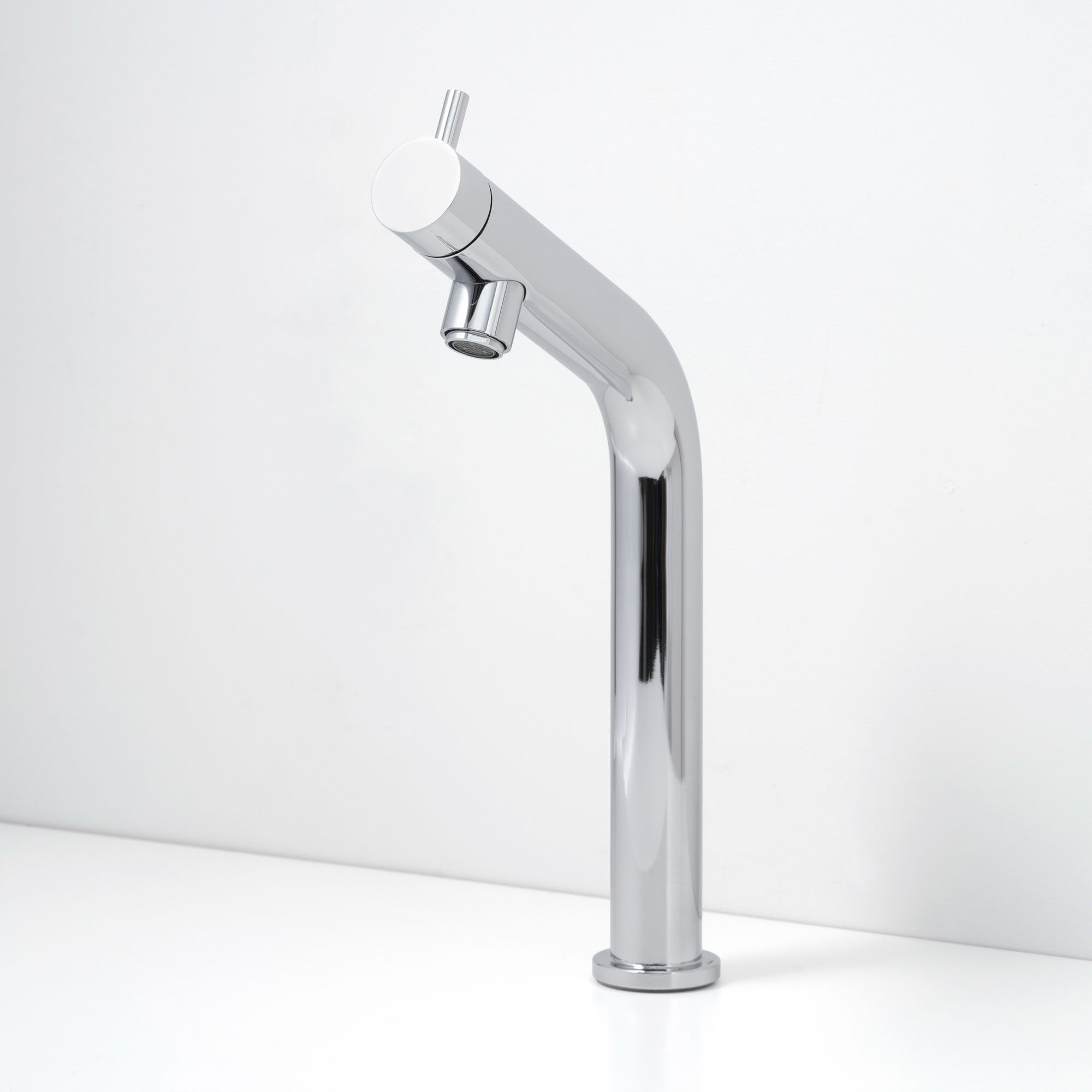 レバーとスパウトの先が一体的なデザインで、先端のレバーを右に回して吐水します。