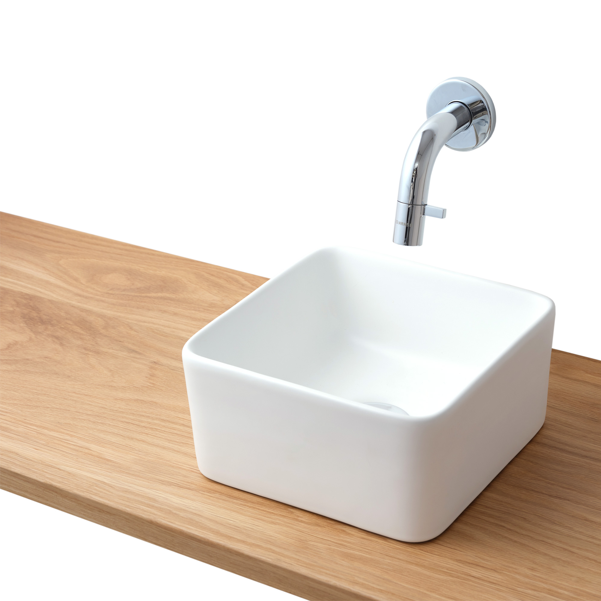 カウンター天板は、こちらの手洗い器に合った位置で穴あけ加工を施していますので一緒にご注文いただくことをおすすめしますが、水栓や金具類は別途ご用意いただいてもOKです。ただし、スパウトの長さやトラップの接続規格などが合うか事前に確認してから選定するようにしてください。