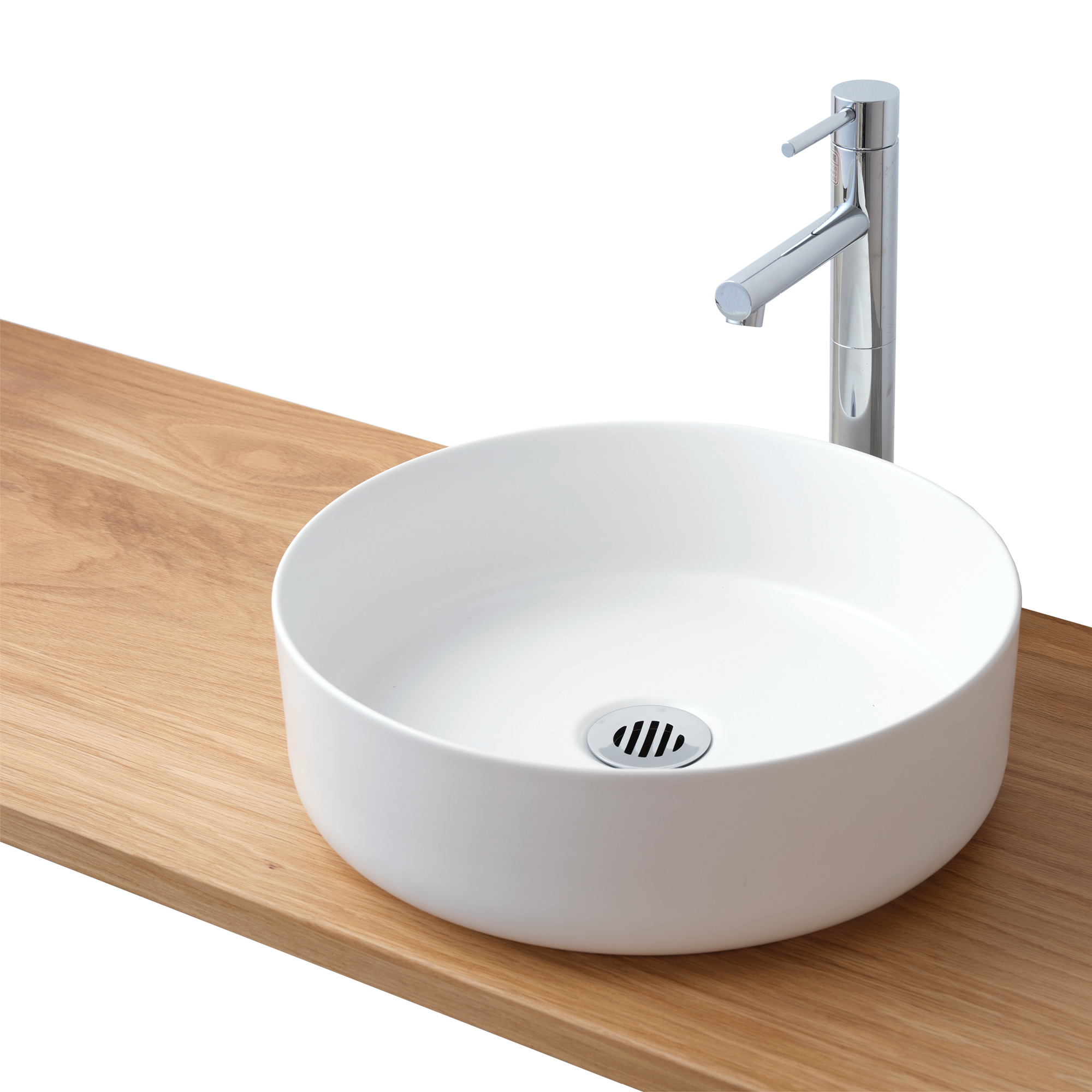カウンター天板は、こちらの手洗い器に合った位置で穴あけ加工を施していますので一緒にご注文いただくことをおすすめしますが、水栓や金具類は別途ご用意いただいてもOKです。ただし、水栓穴径(φ36mm)や接続規格などが合うか事前に確認してから選定するようにしてください。