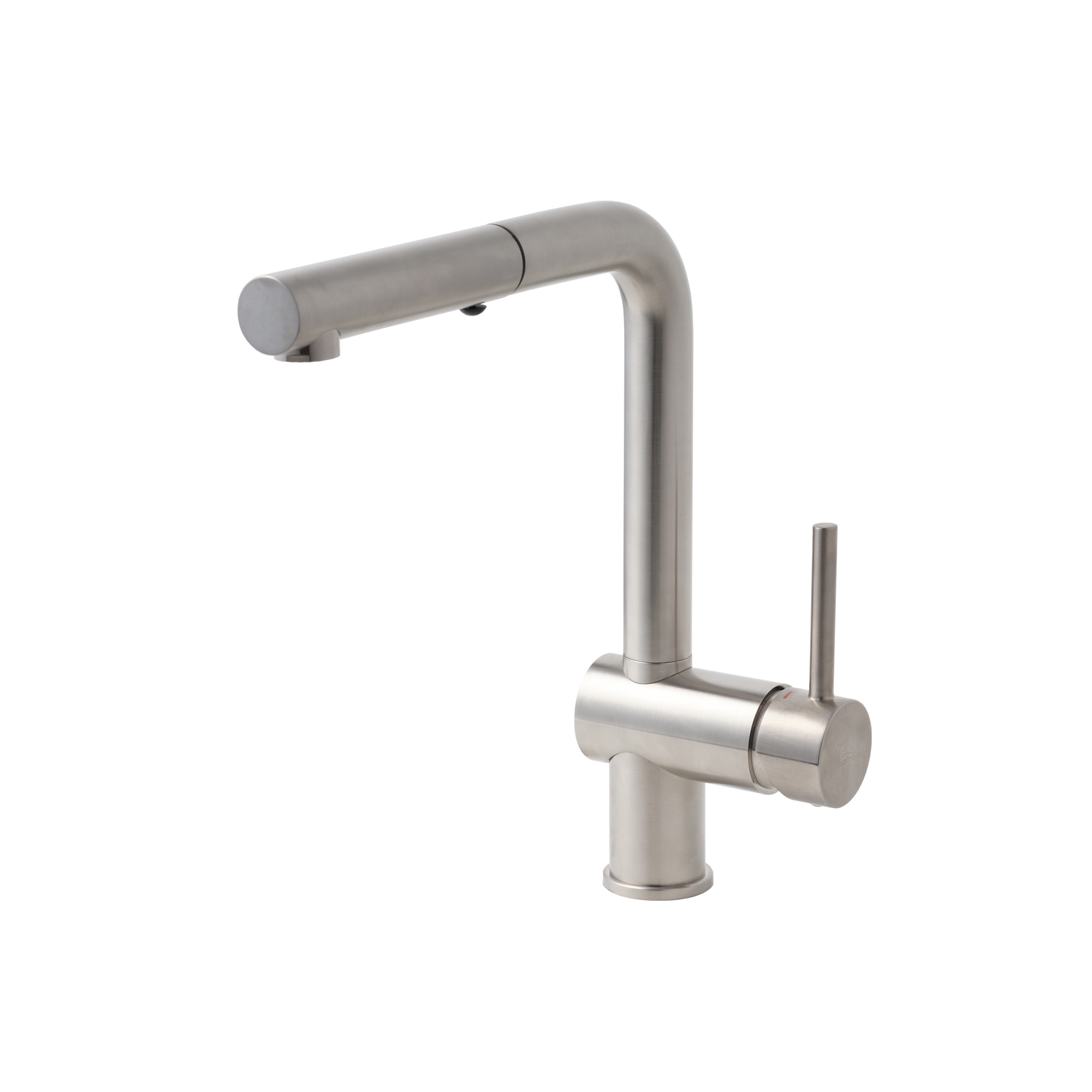 これがホース式の水栓?と思うほどの自然な佇まい。シンクのお手入れに便利なキッチン用のホース式水栓、「アングル混合栓」のサテンメッキ仕上です。
