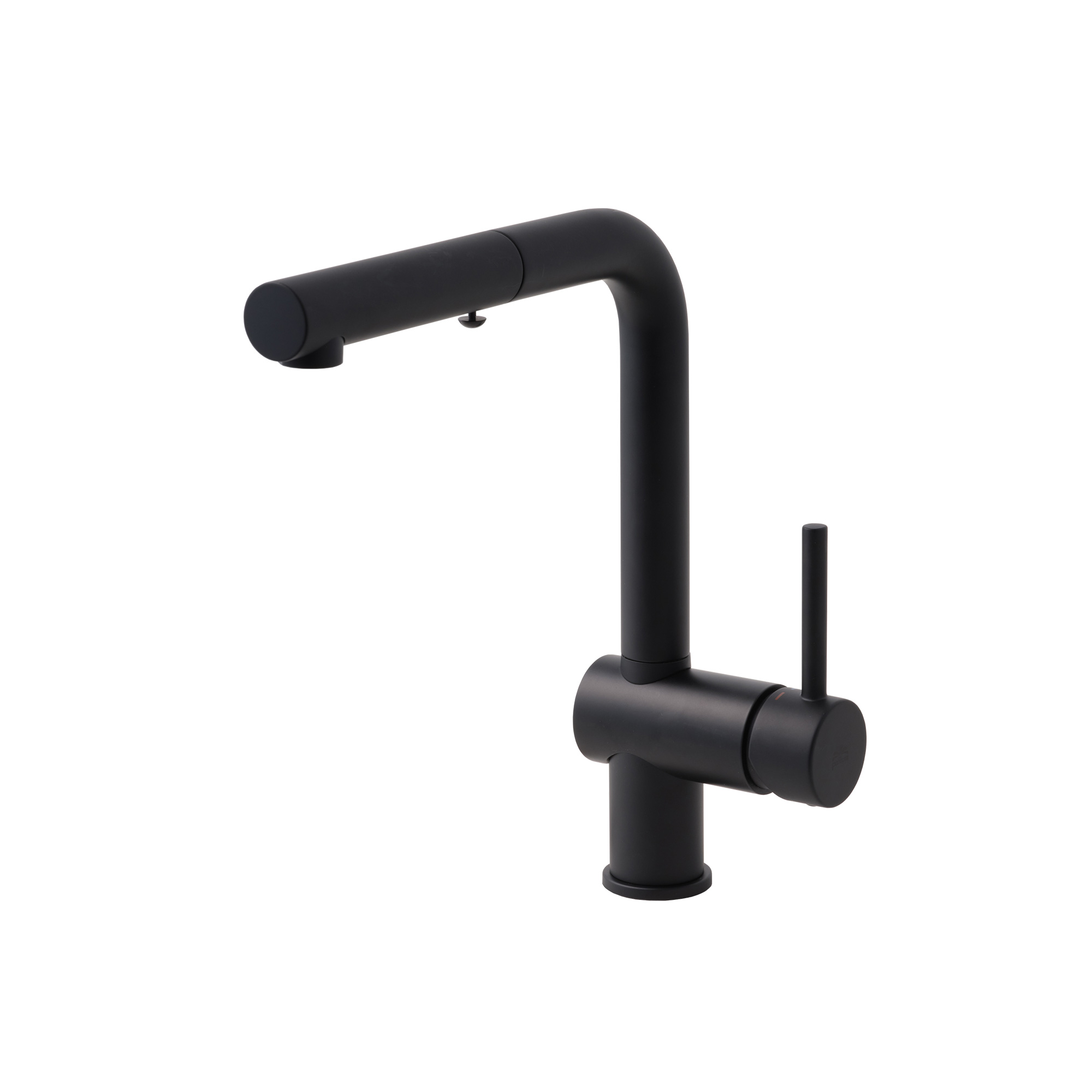 これがホース式の水栓?と思うほどの自然な佇まい。シンクのお手入れに便利なキッチン用のホース式水栓、「アングル混合栓」のブラック仕上です。