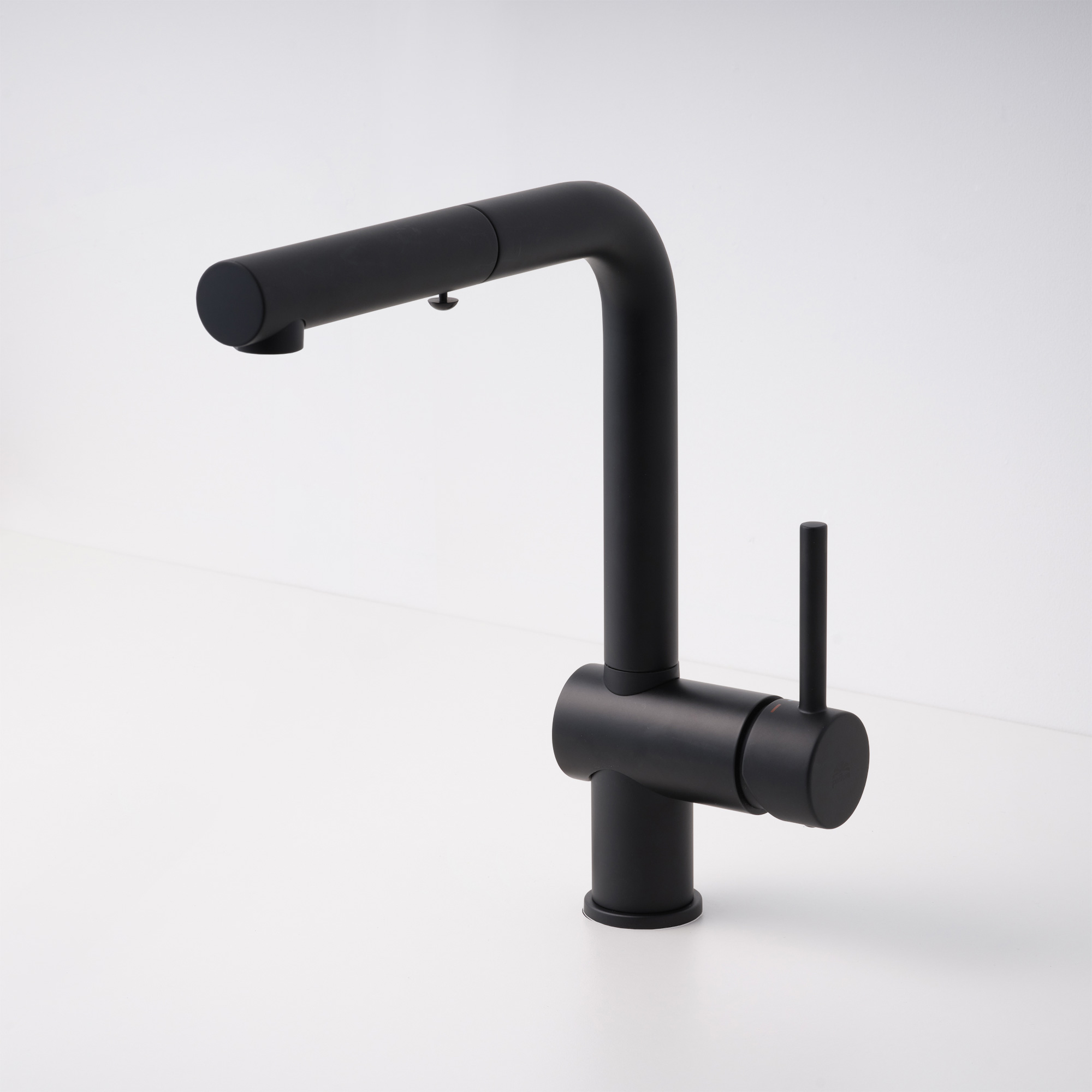 これがホース式の水栓?と思うほどの自然な佇まい。シンクのお手入れに便利なキッチン用のホース式水栓、「アングル混合栓」のブラック仕上です。