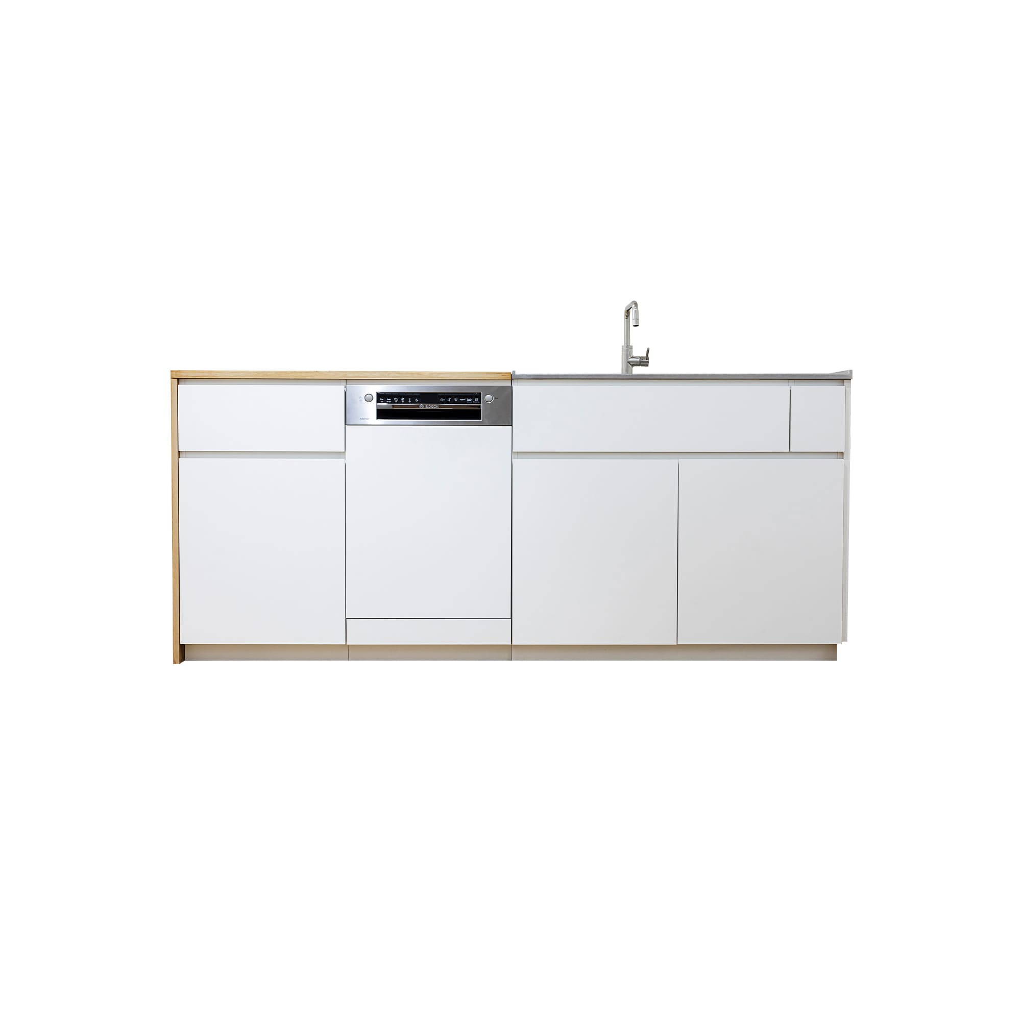 食洗機については、キャビネットと同じ材質の面材をキッチン本体の付属品としてお届けしますので、機器は別途ご用意いただいても構いませんが、機種が同一でなければ取り付けられませんので、その点のみご注意ください。