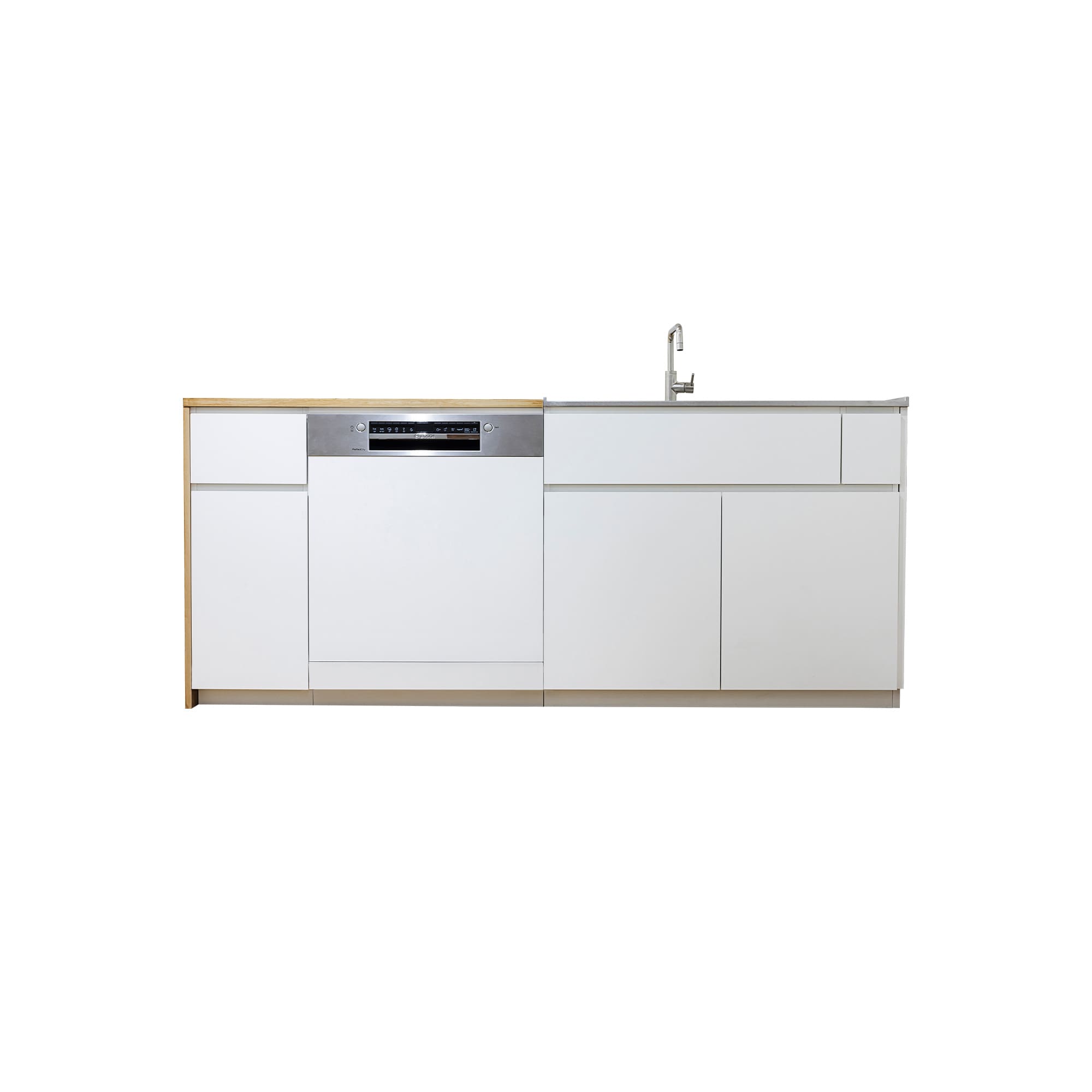 食洗機については、キャビネットと同じ材質の面材をキッチン本体の付属品としてお届けしますので、機器は別途ご用意いただいても構いませんが、機種が同一でなければ取り付けられませんので、その点のみご注意ください。