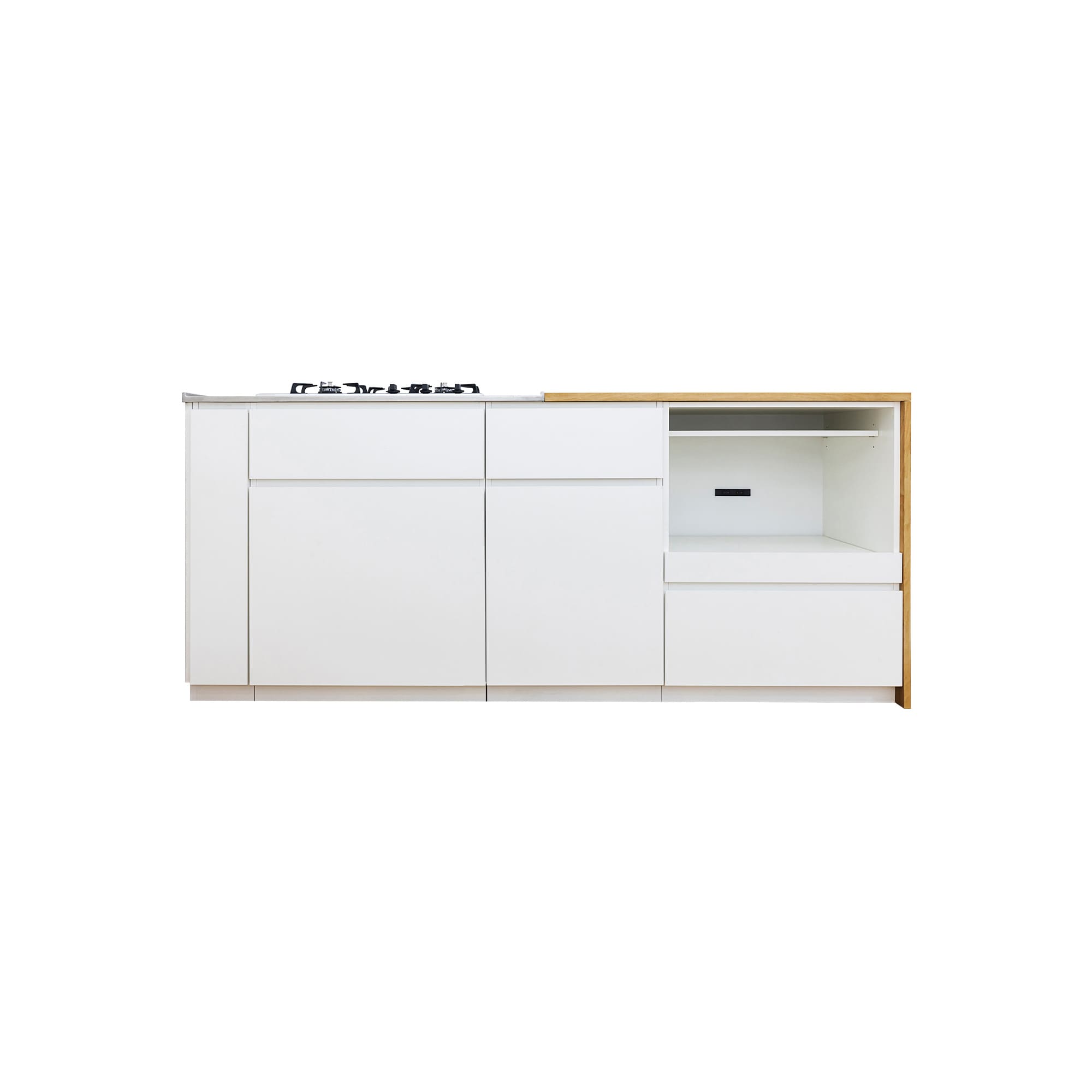 もう少し小ぶりでキッチン中央に引き出しのないW1390〜1690タイプや、魚焼きグリル付きのコンロを設置したい方、ビルトインガスオーブンも設置したい方向けのキャビネットも別途ご用意しています。詳細は、それぞれの商品ページをご覧ください。