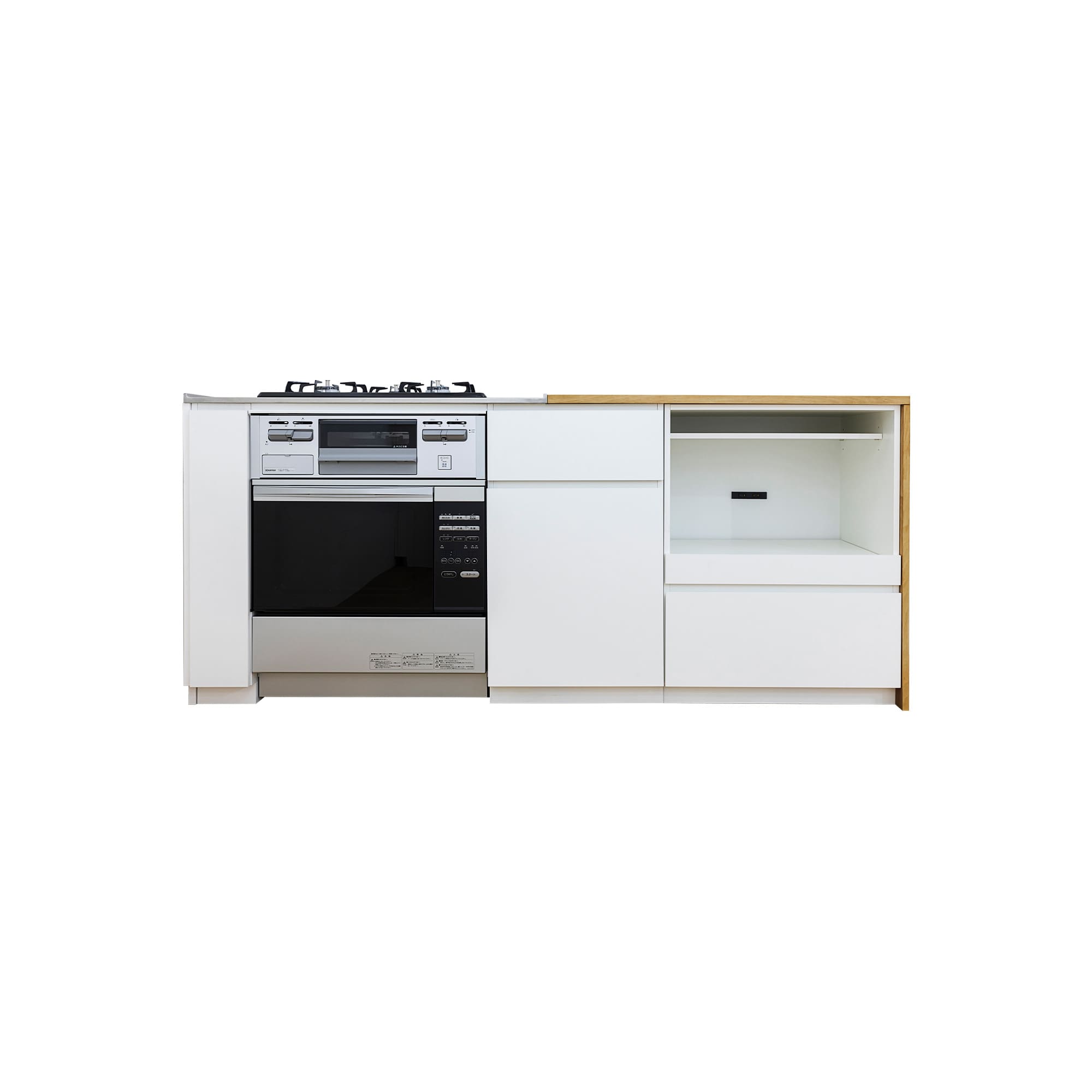 もう少し小ぶりでキッチン中央に引き出しのないW1390〜1690タイプや、魚焼きグリル付きのないコンロを設置したい方、ビルトインガスオーブンは設置しない方向けのキャビネットも別途ご用意しています。詳細は、それぞれの商品ページをご覧ください。