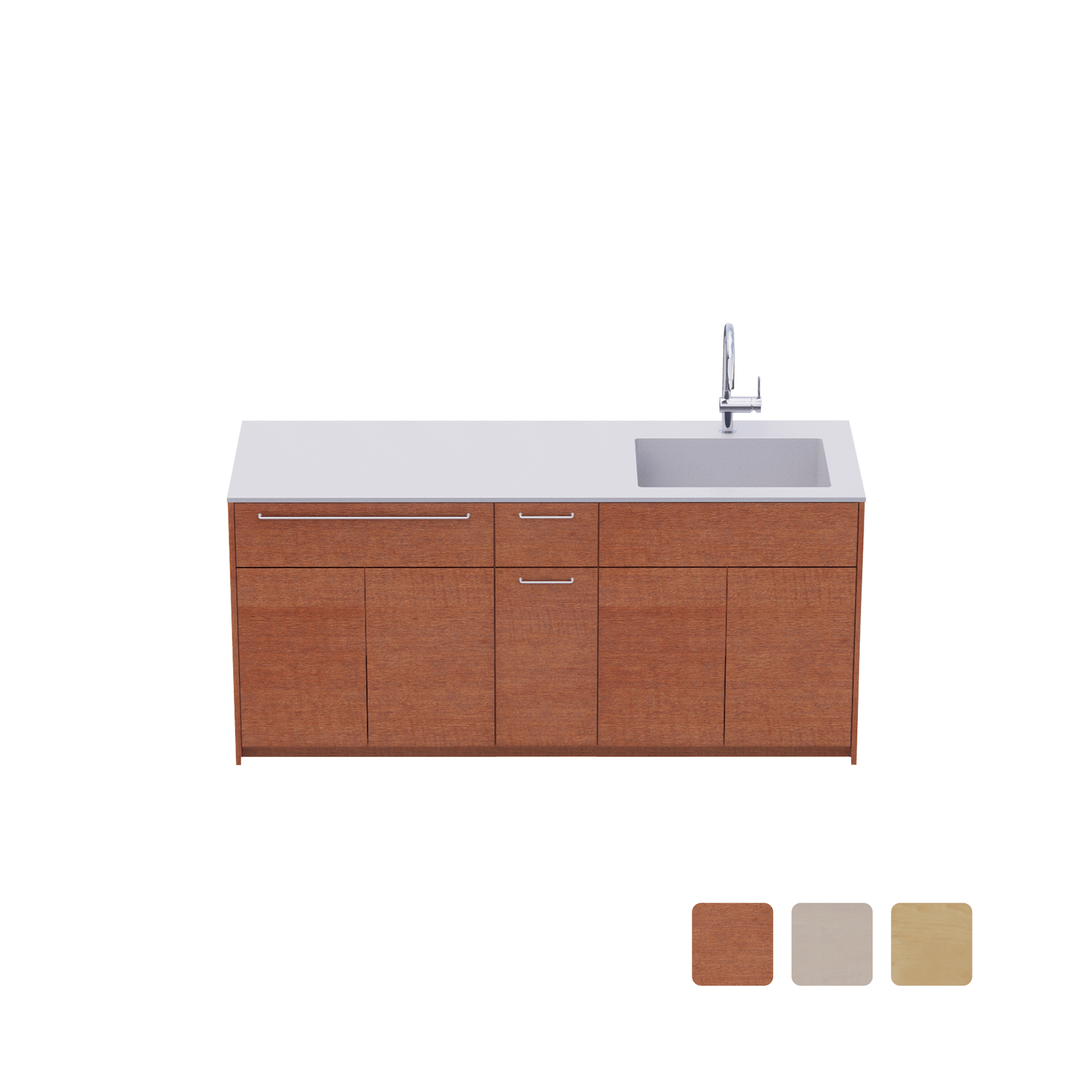 | 素材 | 天板:ステンレス(SUS304) 面材:ラワン合板 / シナ合板 / バーチ合板(3種類から選択可能) キャビネット:パーティクルボード(ブラック) 把手:ステンレス(SUS304) ※ 把手ありを選択した場合 |