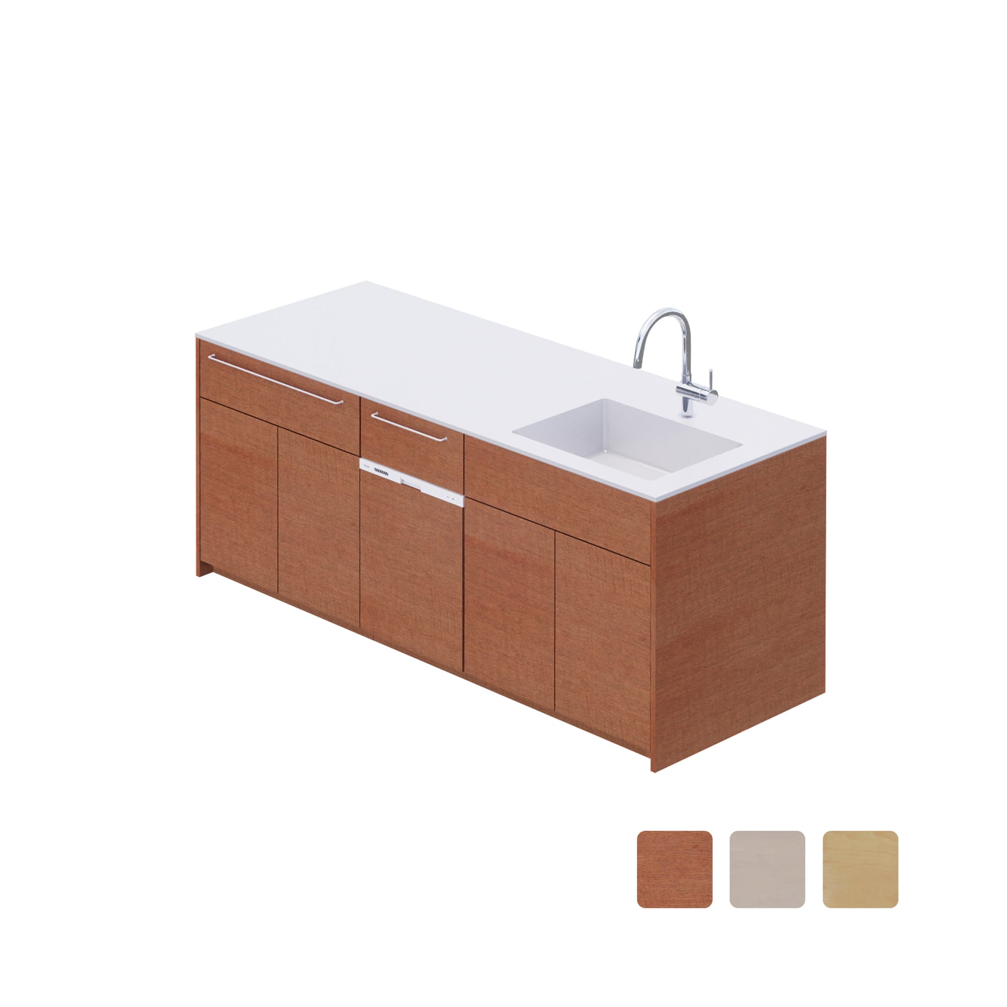 食洗機については、キャビネットと同じ材質の面材をキッチン本体の付属品としてお届けしますので、機器は別途ご用意いただいても構いませんが、機種が同一でなければ取り付けられませんので、その点のみご注意ください。