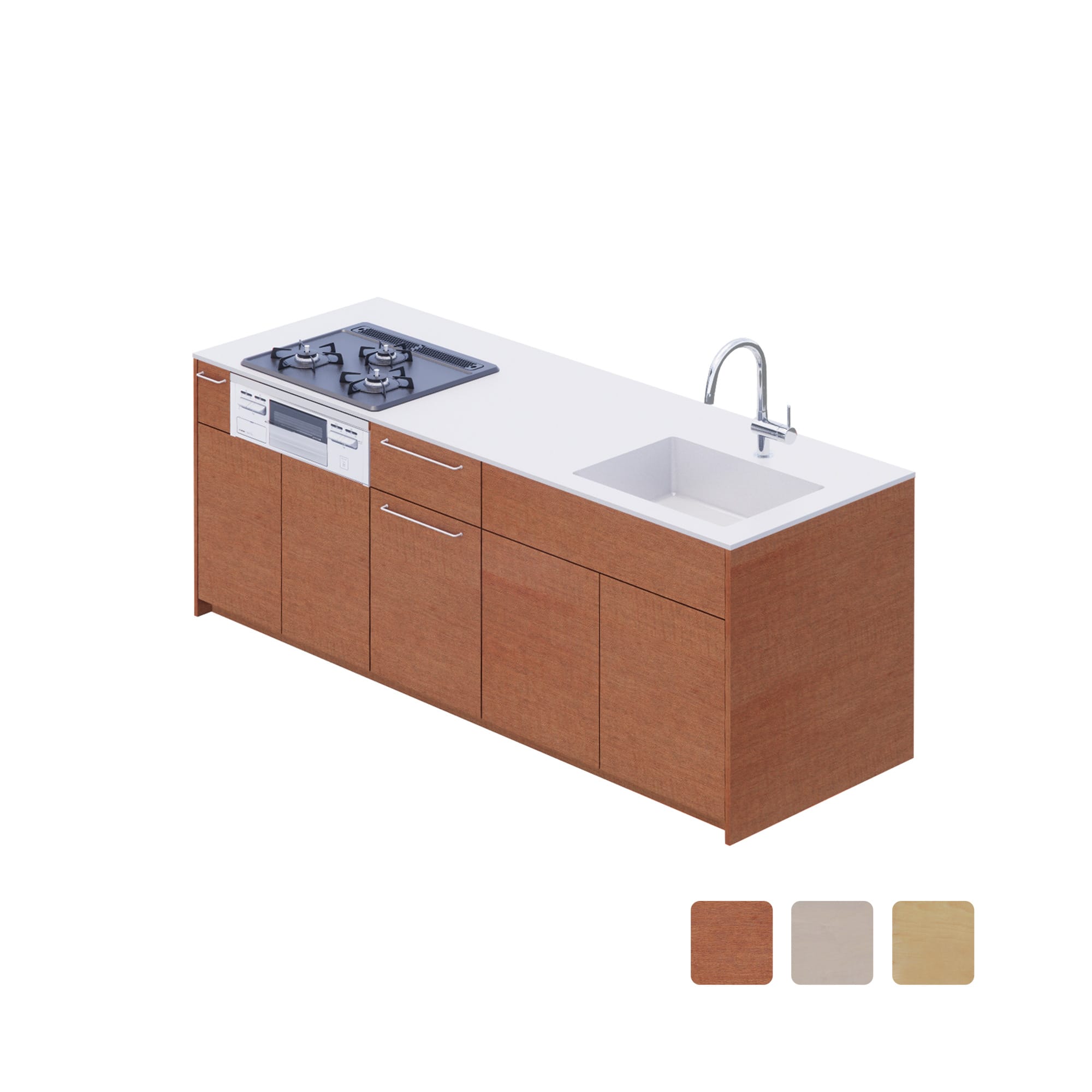 こちらは奥行き750mmの対面型で、幅は2140mmと2290mmの2種類から選べます。オーブンと食洗機はなく、コンロのみを設置できるタイプです。