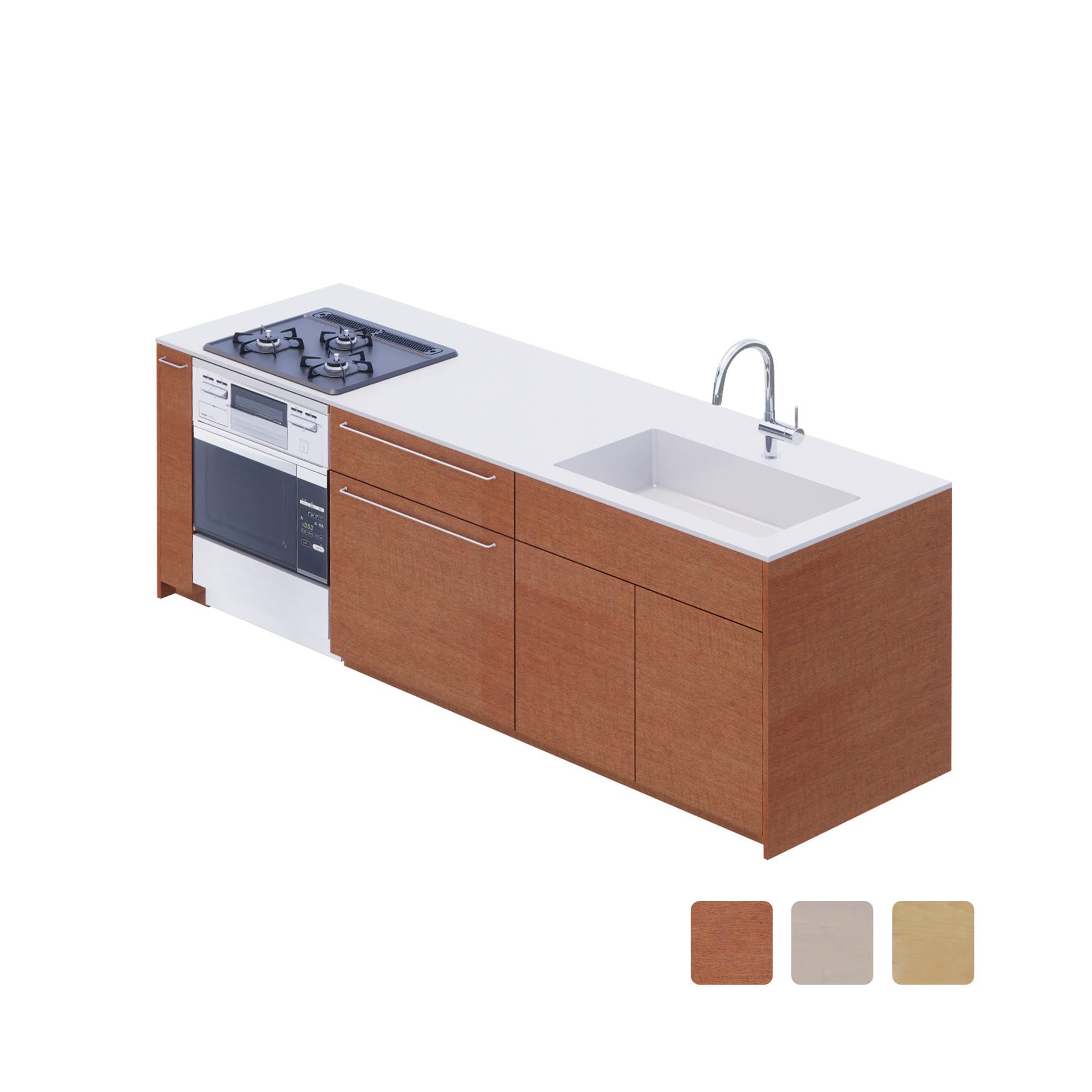 こちらは奥行き750mmの対面型で、幅は2440mm・2590mm・2740mmの3種類から選べます。食洗機はなく、コンロとオーブンを設置できるタイプです。
