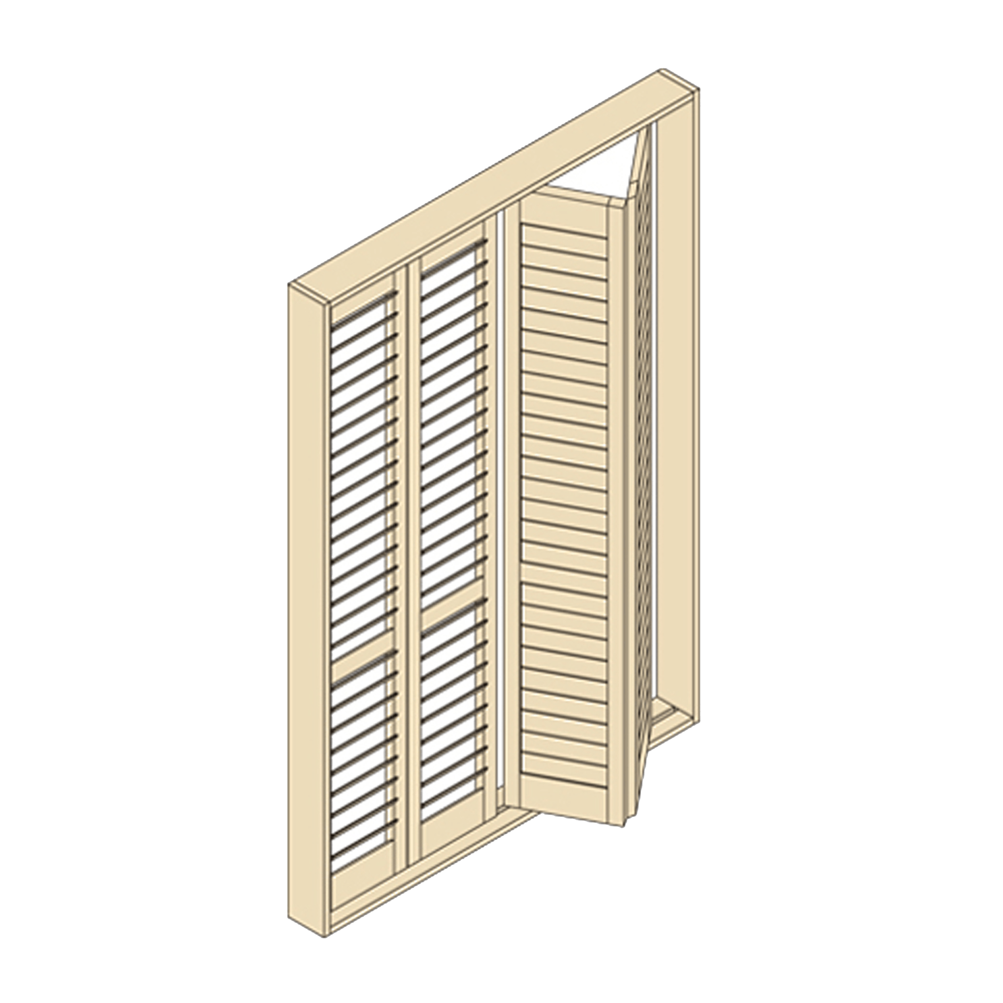 海外の住宅の窓辺についていそうな、折れ戸タイプのウッドシャッターです。こちらは両開き用で、2ユニット分のパネル4枚を1セットとして販売しています。