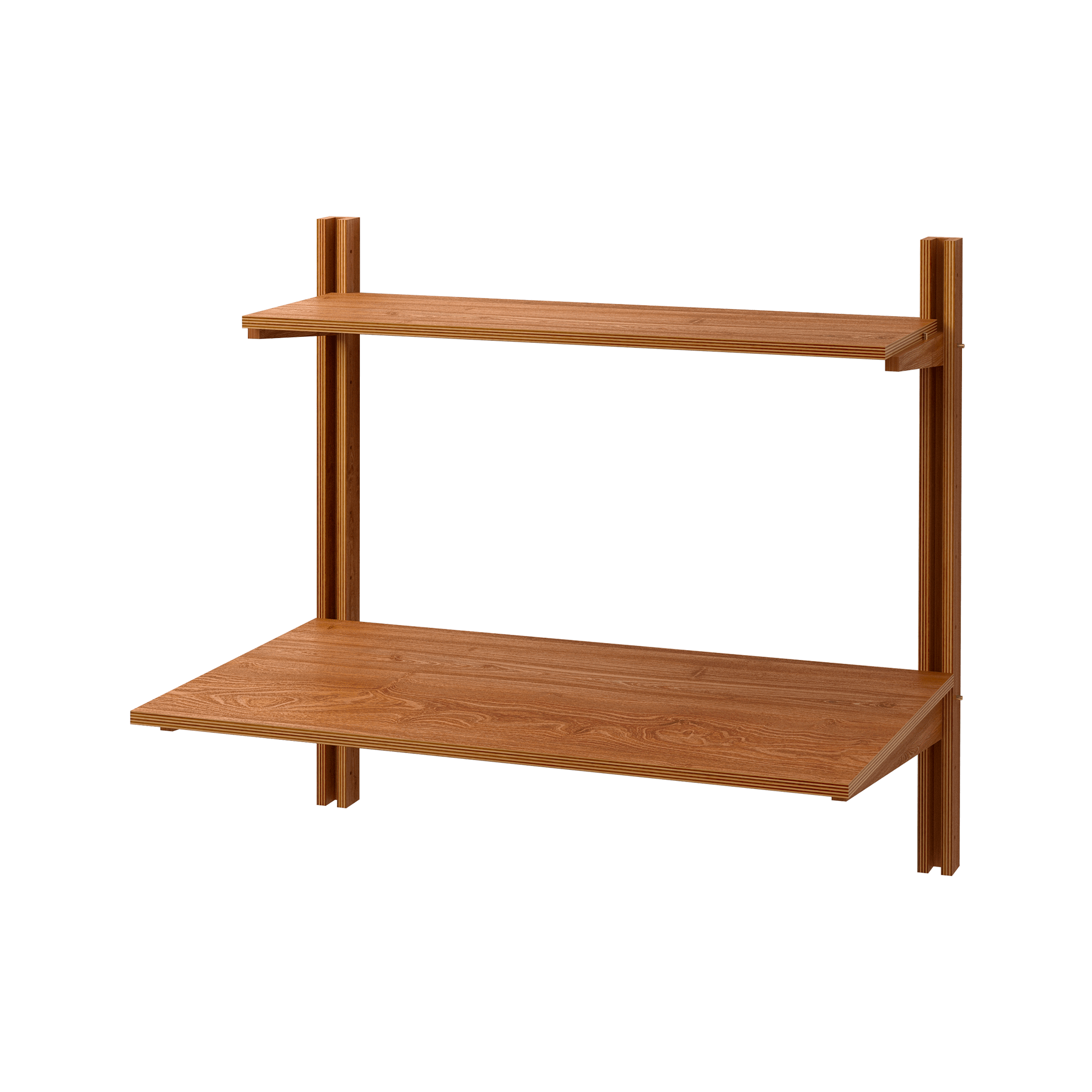 こちらのデスク天板は、他のパーツと同じ仕様の落ち着いた色味。棚柱と壁の隙間にパソコンのコードやコンセントを配線できるのも、使いやすさのポイント。読書したり、少し書き物をしたり。コーヒーをこぼしてしまってもウレタン塗装なので、すぐ拭いていただければ染み込む心配もありません。