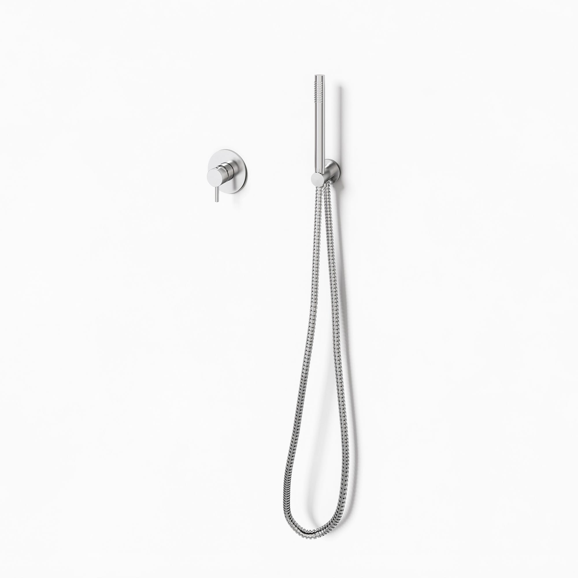レバー本体の機構は壁の内部に収まり、レバーとハンドシャワーだけが壁から出るミニマルなデザイン。小さな丸い金具が空間のアクセントになります。