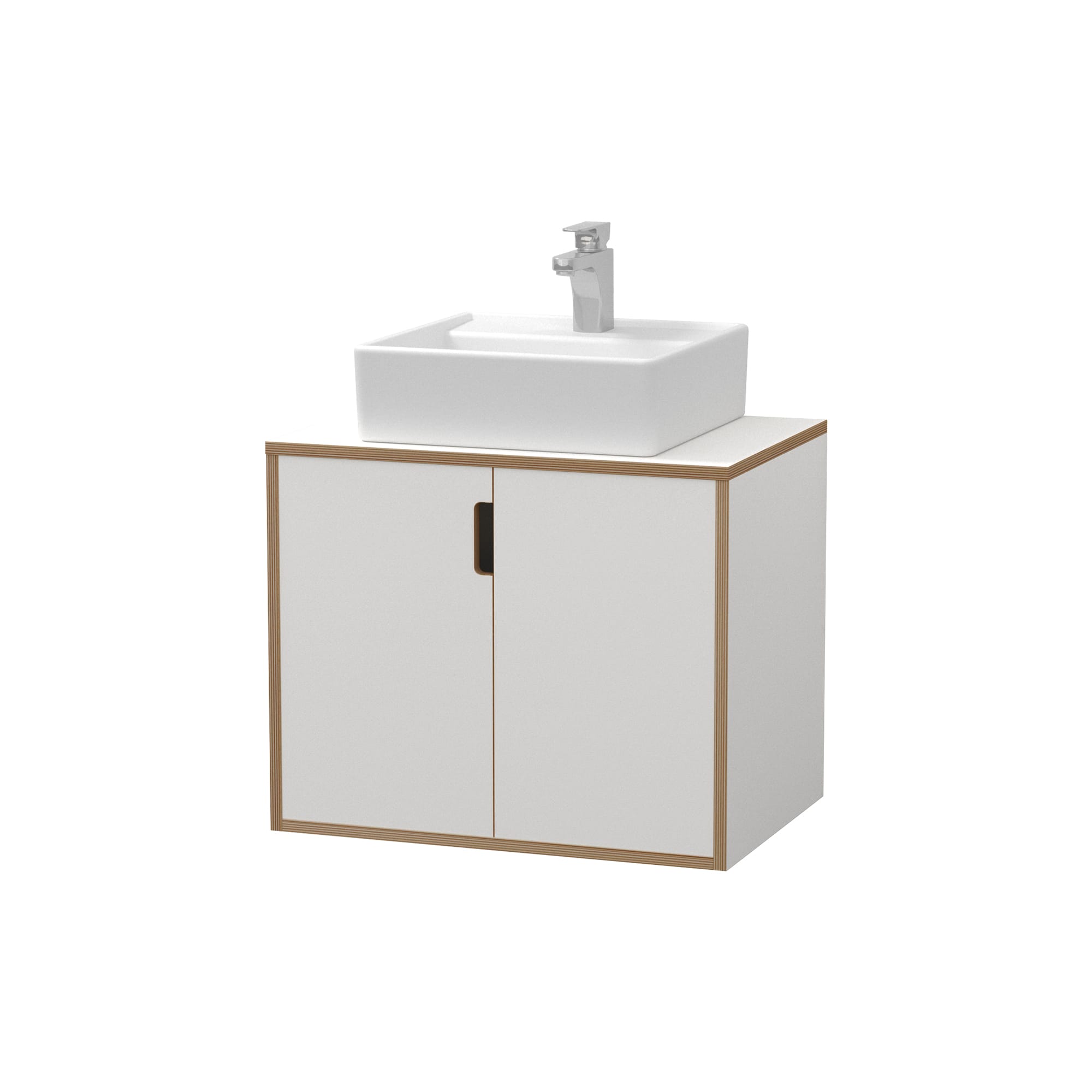 積層の木口がポイントのフロートタイプの洗面台。バーチのプライウッドが気負わない雰囲気をつくりだします。