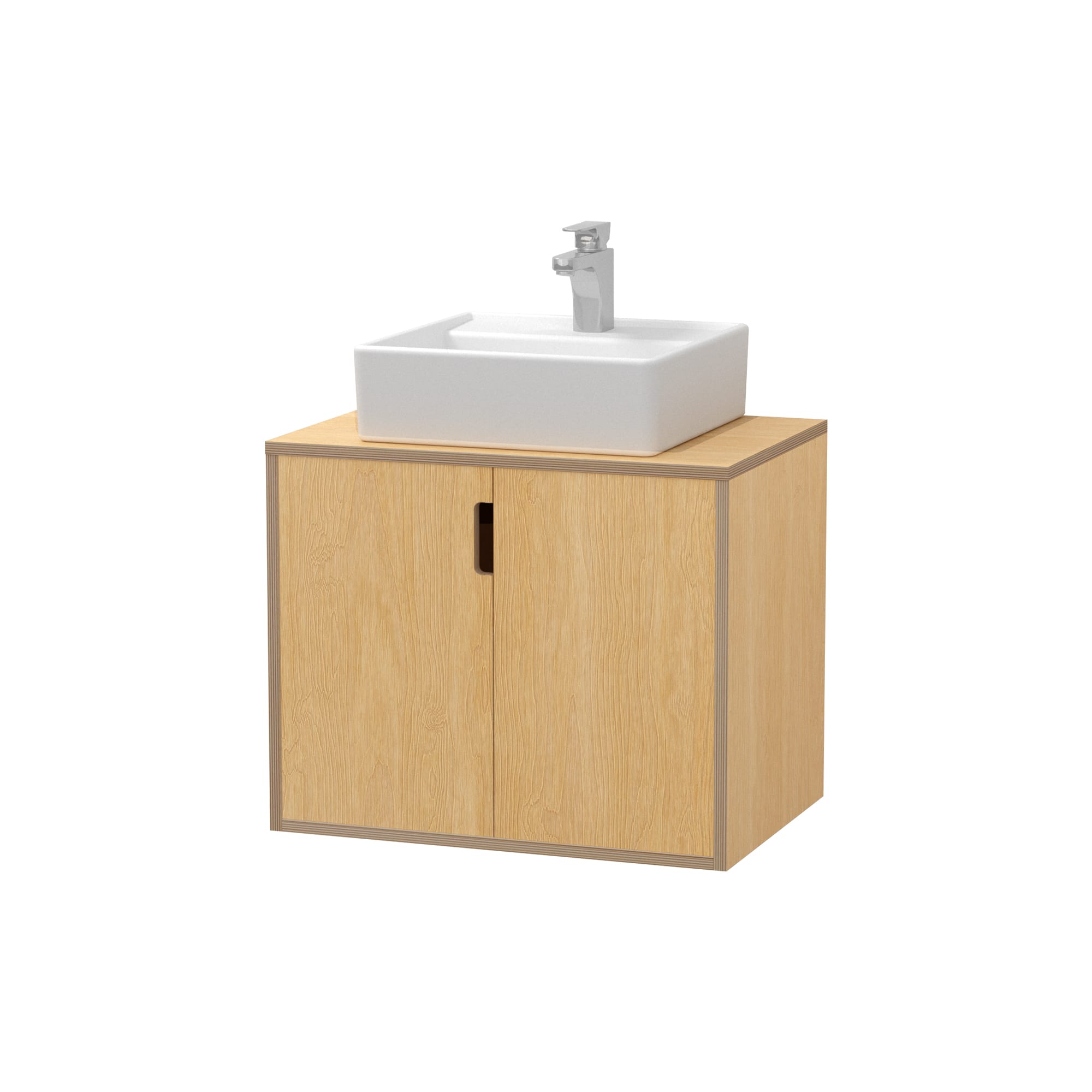 積層の木口がポイントのフロートタイプの洗面台。バーチのプライウッドが気負わない雰囲気をつくりだします。