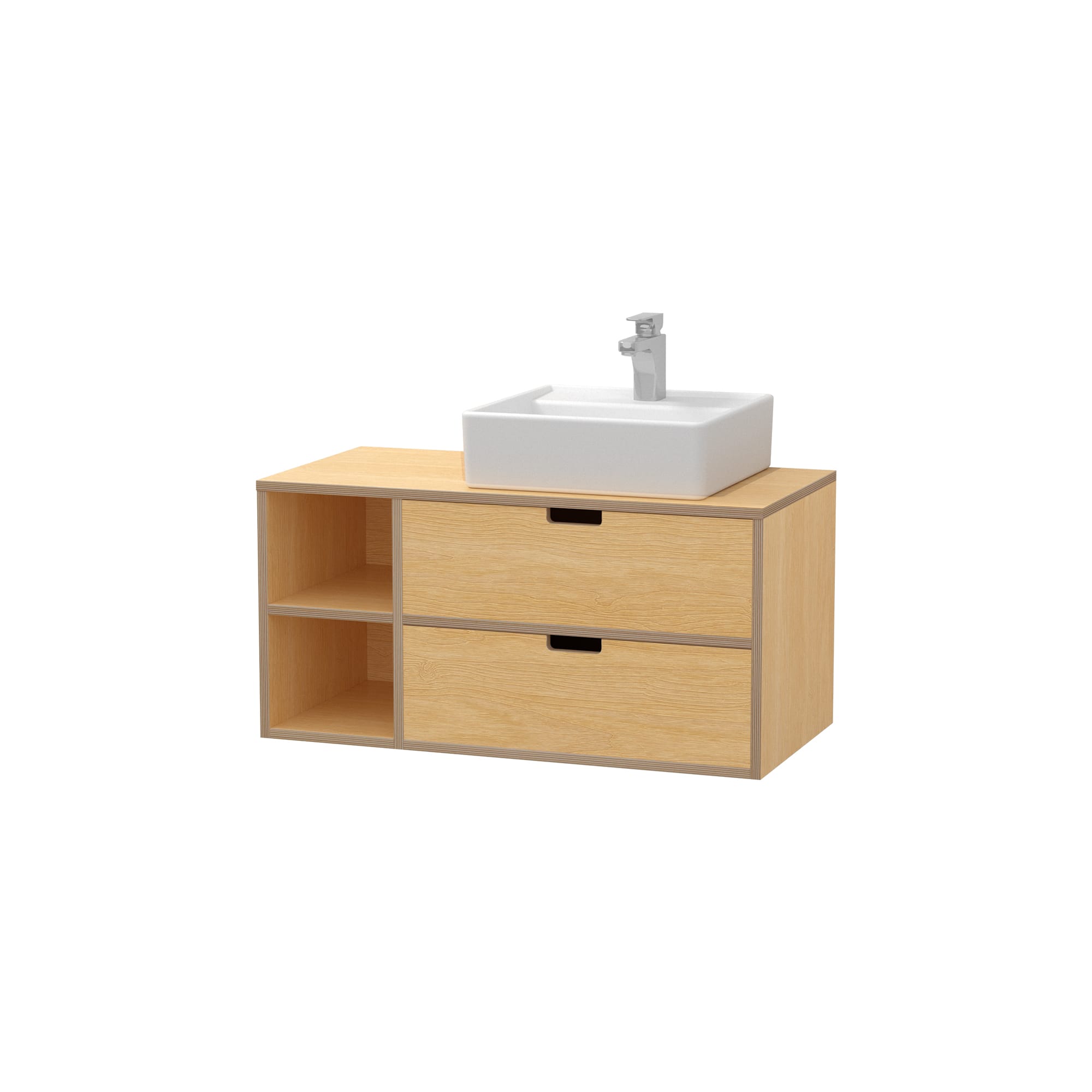 積層の木口がポイントのフロートタイプの洗面台。バーチのプライウッドが気負わない雰囲気をつくりだします。
