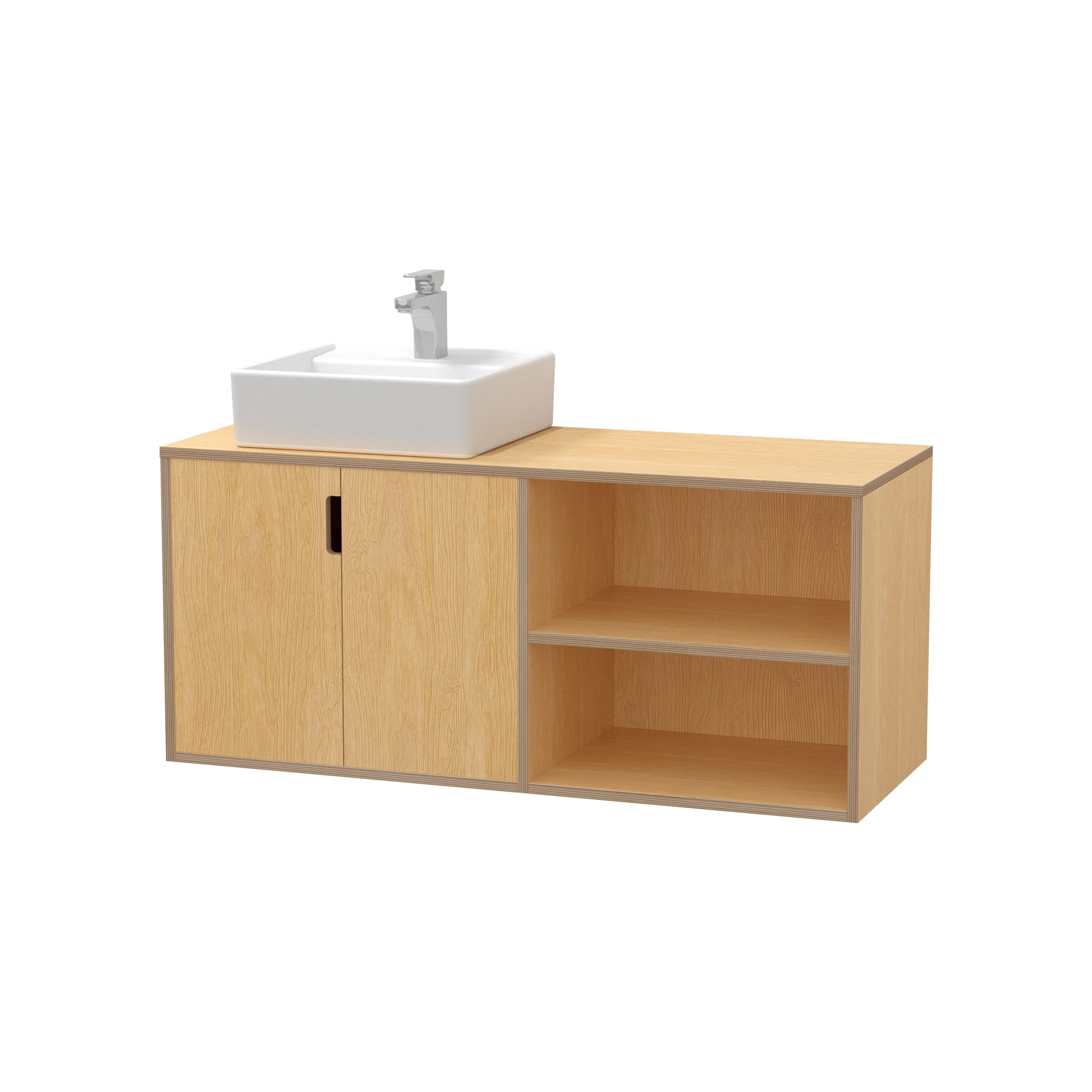 積層の木口がポイントのフロートタイプの洗面台。バーチのプライウッドが気負わない雰囲気をつくりだします。