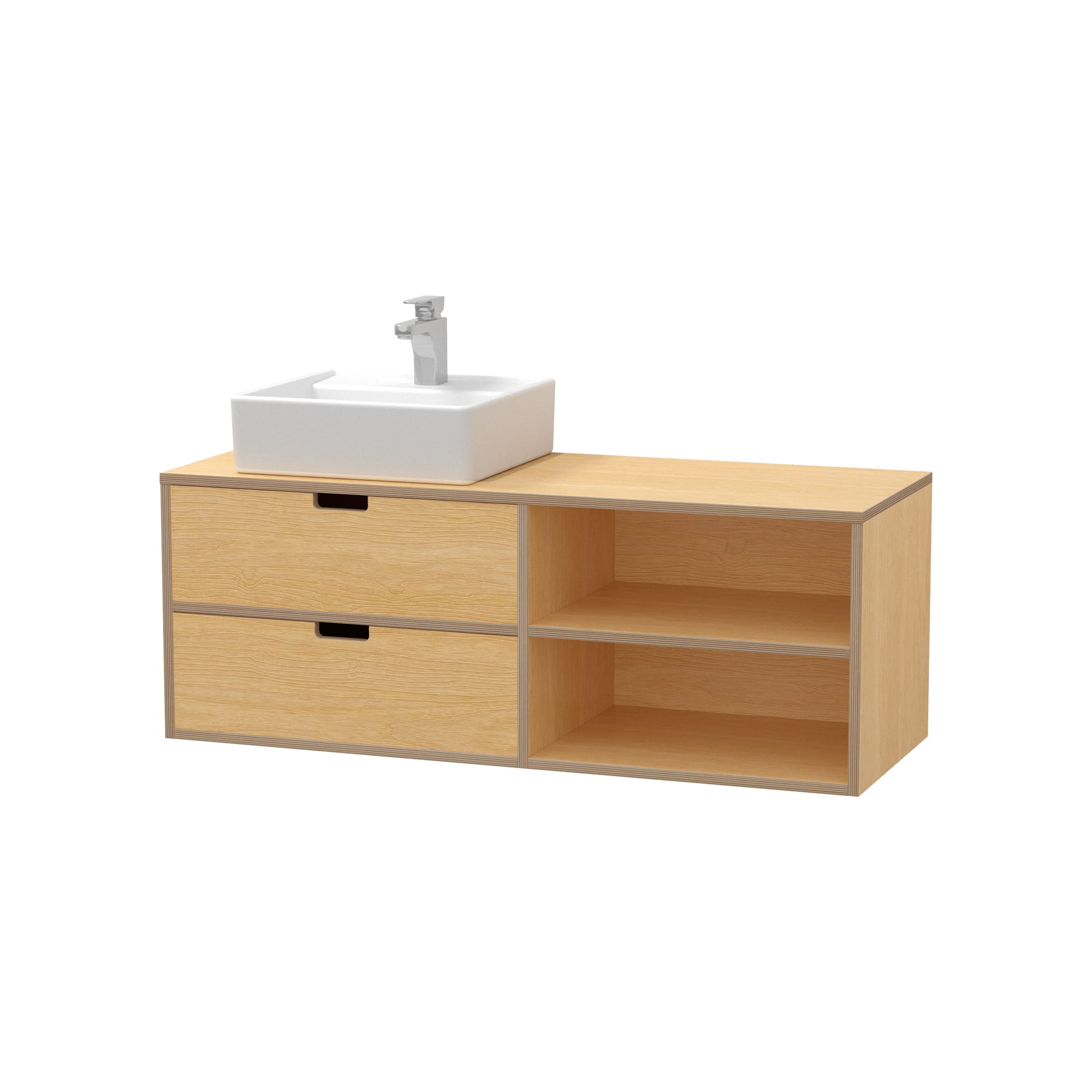積層の木口がポイントのフロートタイプの洗面台。バーチのプライウッドが気負わない雰囲気をつくりだします。