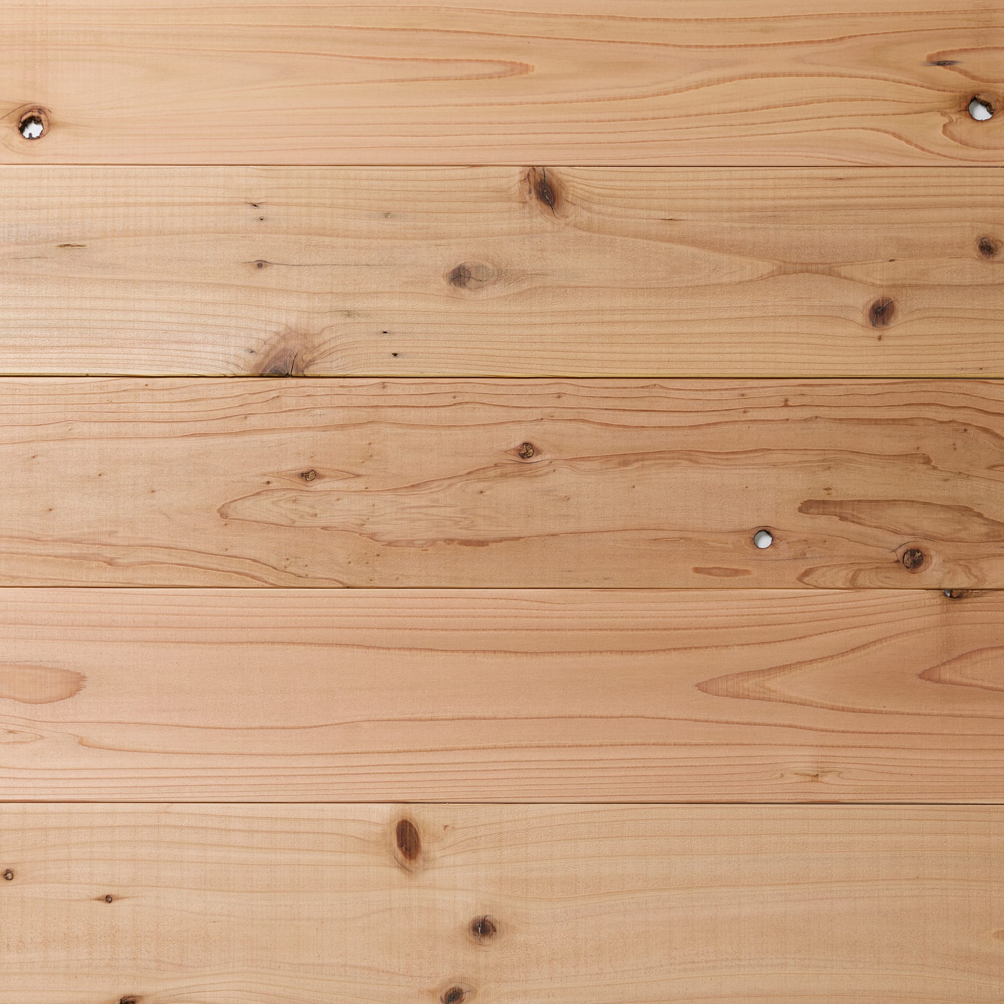 こちらは、現場で使われた古材をスライスして作られています。表面はなめらかに仕上げてあるので、大きなささくれなどはありませんが、毛羽立ち感が少しあったり、釘跡や黒ずみ、節穴が混ざることがあります。