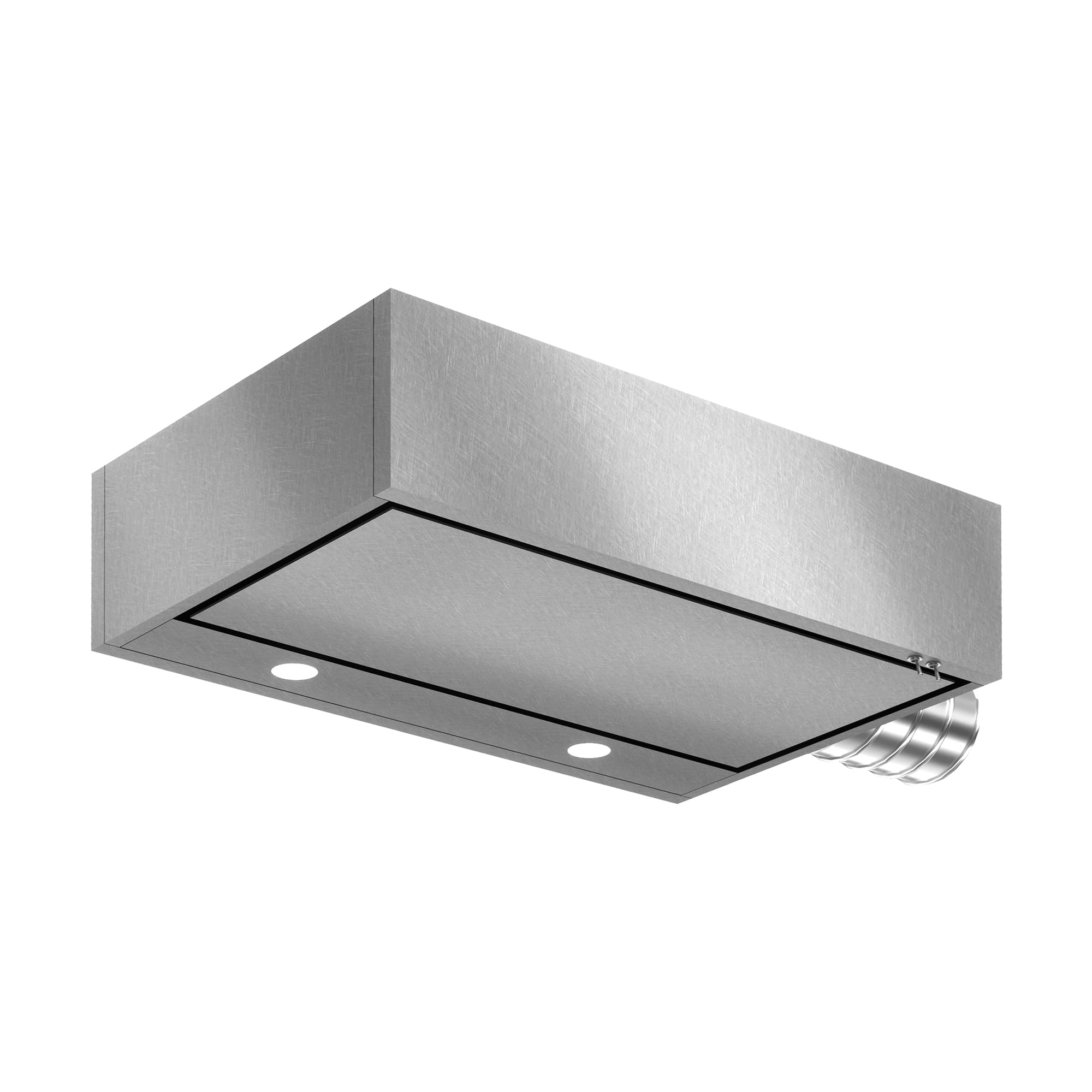 オープンなペニンシュラキッチンに特化した設計の、シンプルな箱型のサイドフードです。吹き抜けや斜め天井等、ボルト吊りがしづらい空間のキッチン計画をも自由にします。