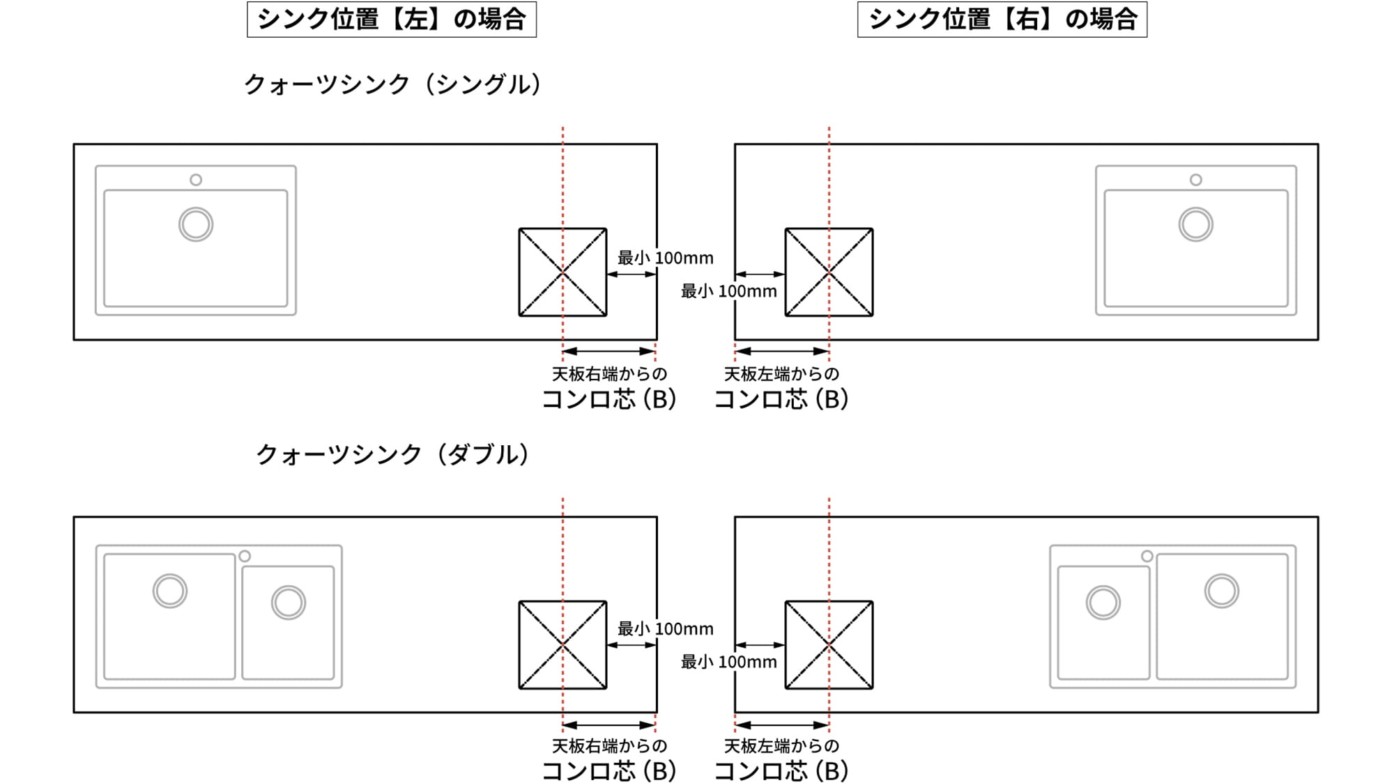 ・シンク位置「右」の場合:天板の「右端」からシンク芯(中央)までの寸法