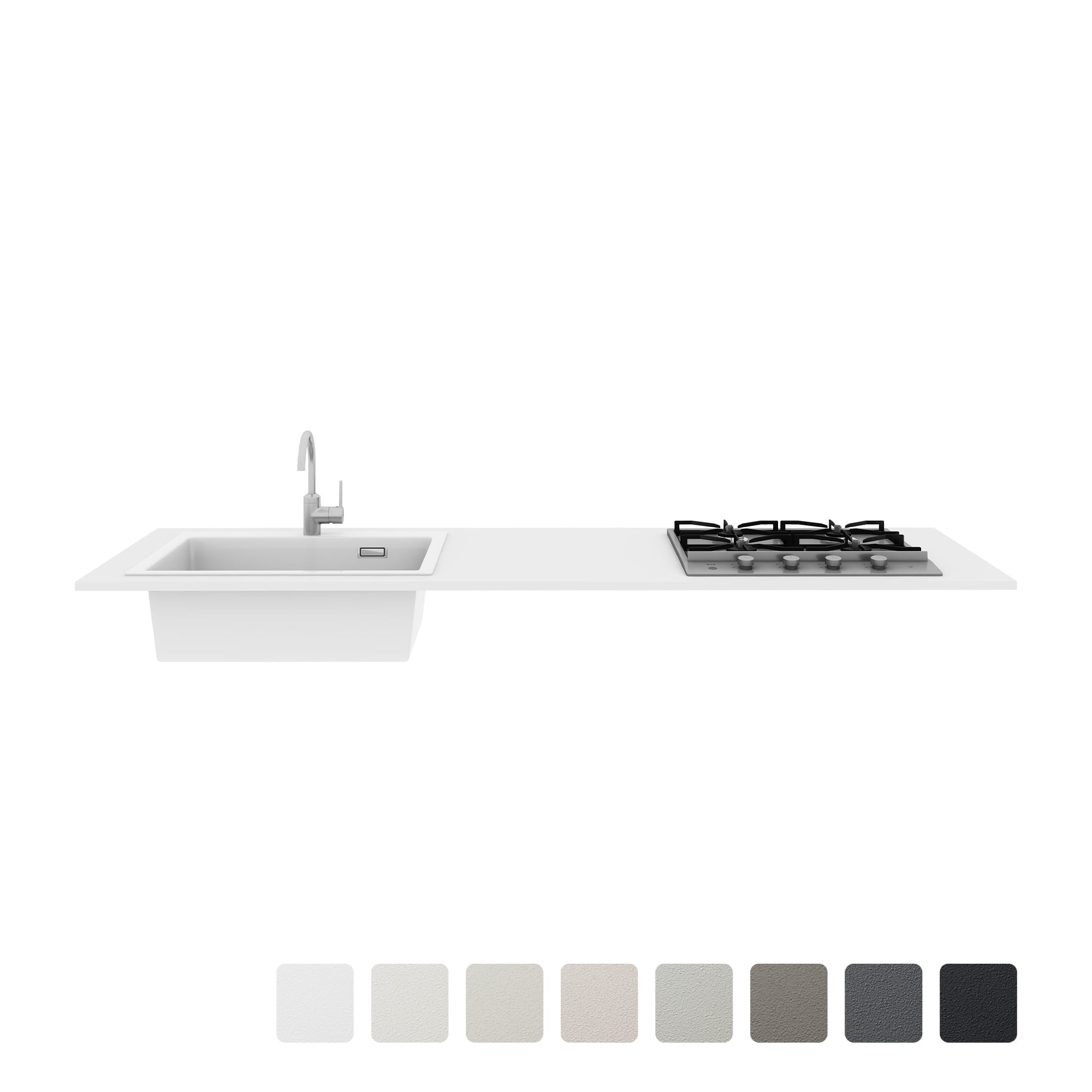 ホワイトからブラックまでのマットな単色8色をご用意しました。暮らしに馴染む色を選んでください。各種のコンロ用開口と、別売りのクォーシンク用開口2種類から選択可能です。