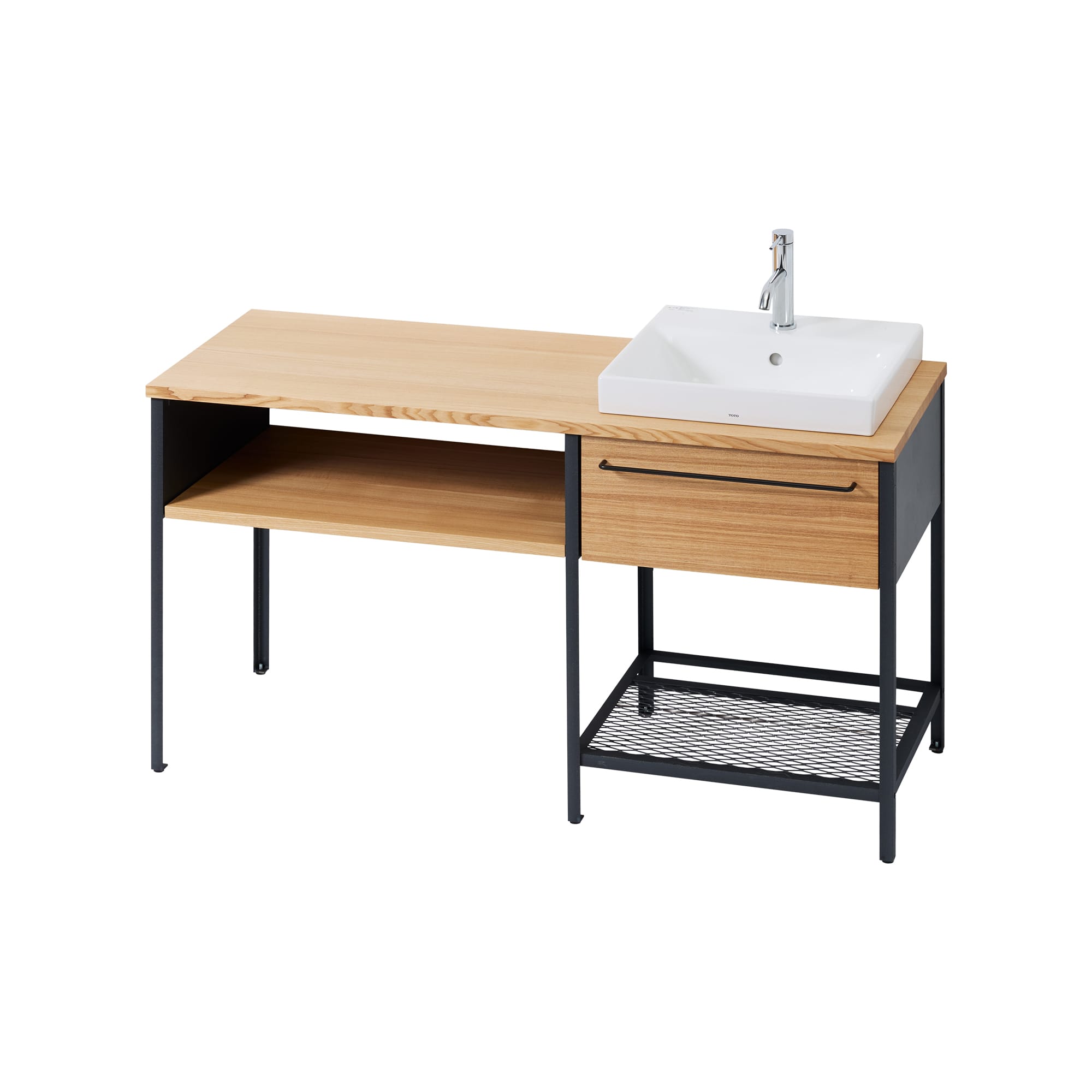 天板と引き出しの前板は、タモの幅はぎ材。水濡れ対策にウレタンクリア塗装を施しています。洗面器は陶器製で、シンプルなスクエア型を採用。水栓の脇には石鹸などが置けるスペースもあります。