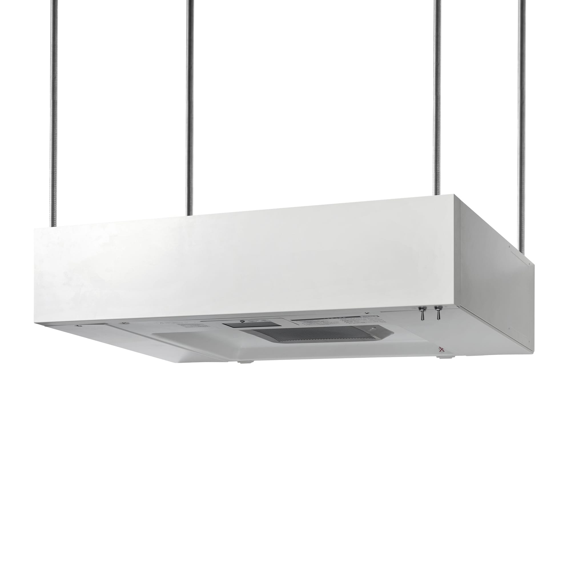 こちらのアイランド型タイプは、バックパネルを取り付けて、本体上面の天井吊りボルト用のノックアウトを開けることでアイランドキッチンやペニンシュラキッチンで使える仕様になります。吊りボルトは現場に合わせて別途ご用意ください。