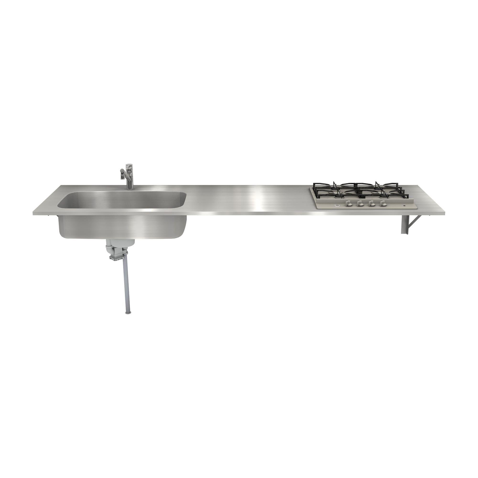 継ぎ目なくシンクが付いた、ステンレスのキッチン天板です。天板の幅と奥行きをサイズオーダーできるようにしているので、設置したい場所にぴったりと収まります。